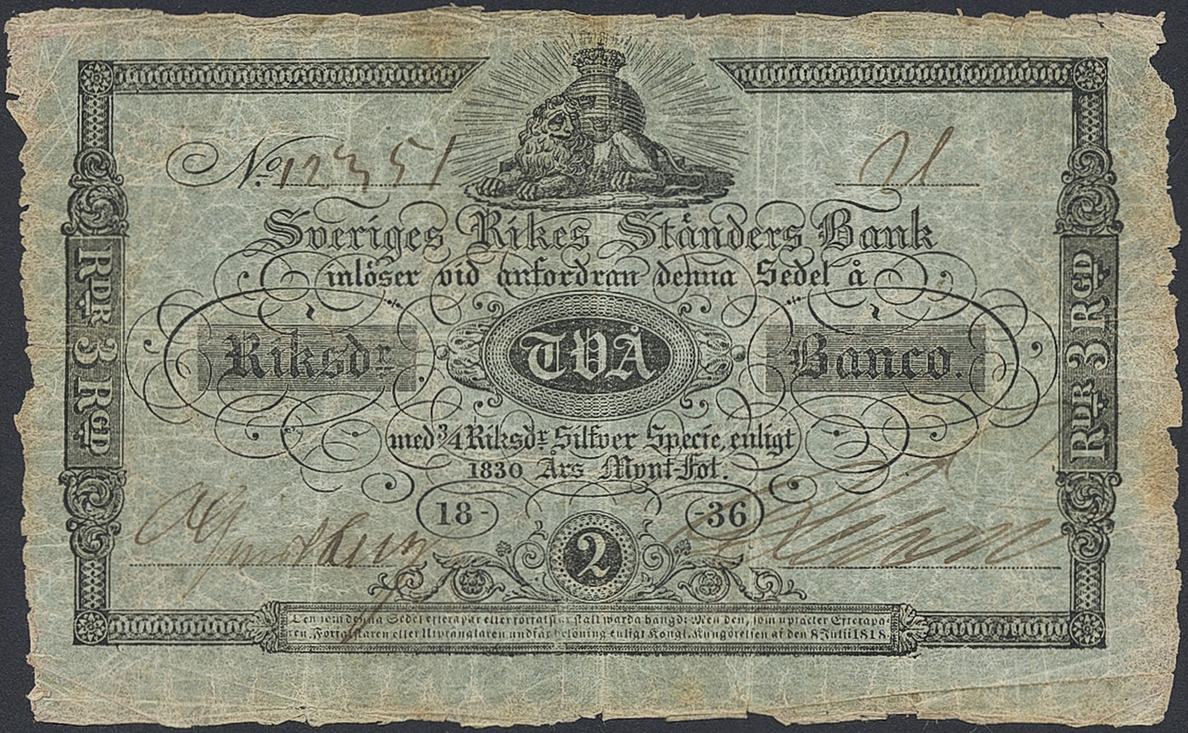 Banknotes, Sweden. SF B1:1, 2 riksdaler banco 1836. Litt U. No 12351. 1.