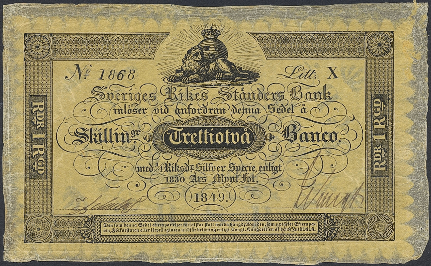 Banknotes, Sweden. SF A2:4, 32 skillingar banco 1849. Litt X. No 1868. Insignificant pinhole in margin. Ex. Myntkompaniet 3 lot 6633. 01.