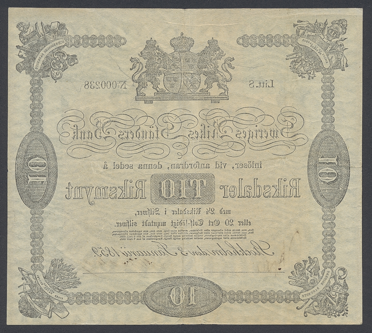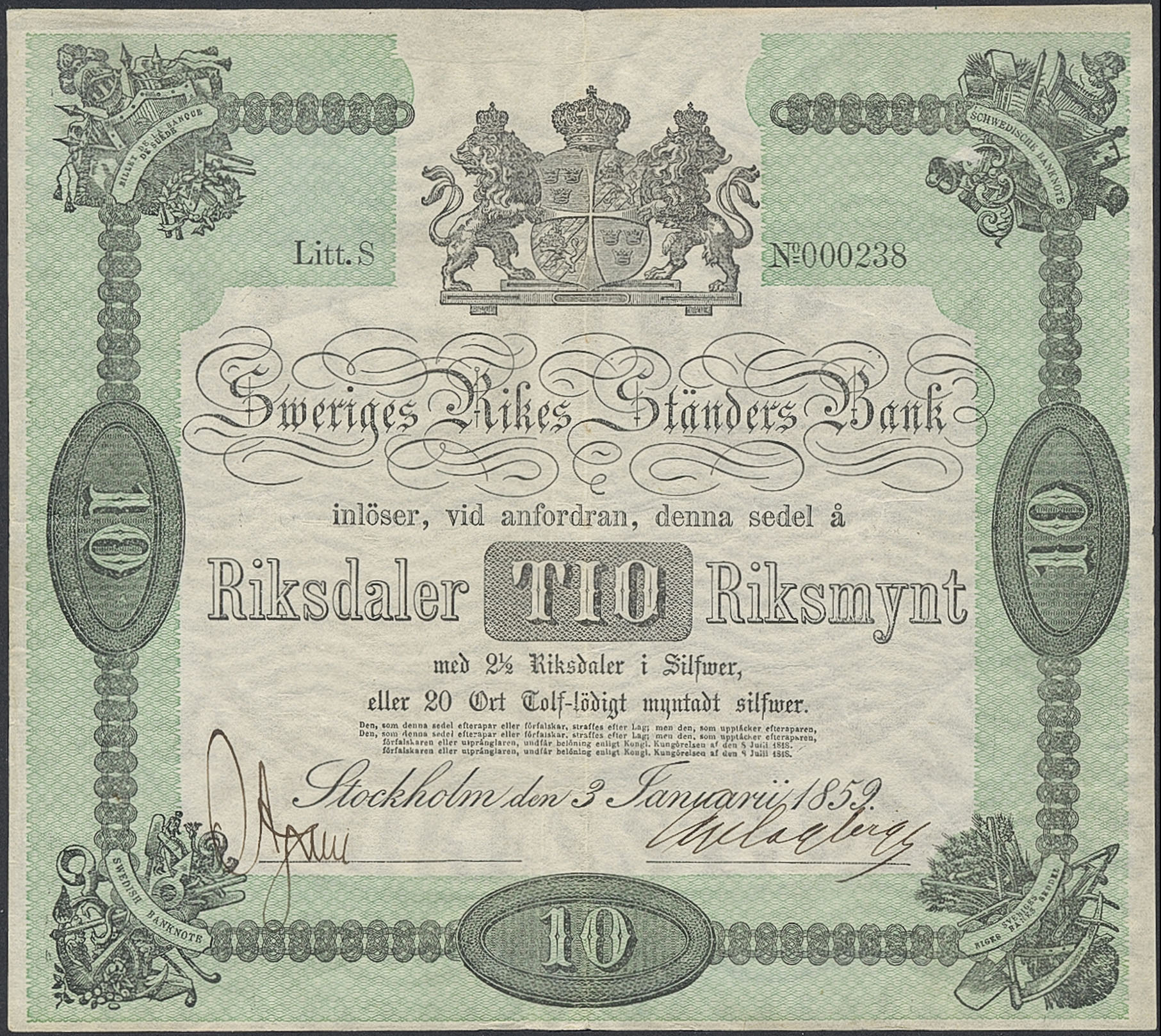 Banknotes, Sweden. SF K1:1, 10 riksdaler riksmynt 1859. Litt S. No 000238. Beautiful example with centre fold and some handling marks. 1+/01.