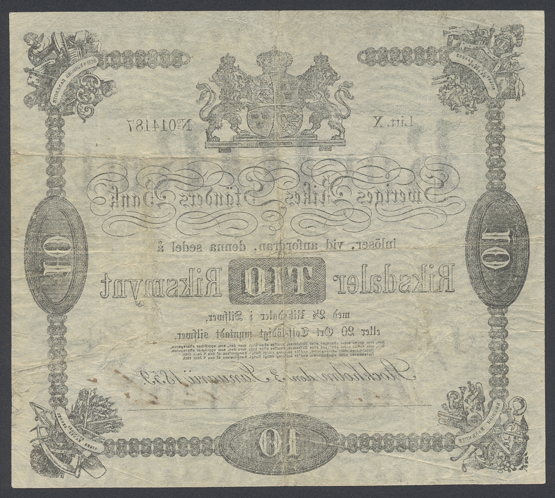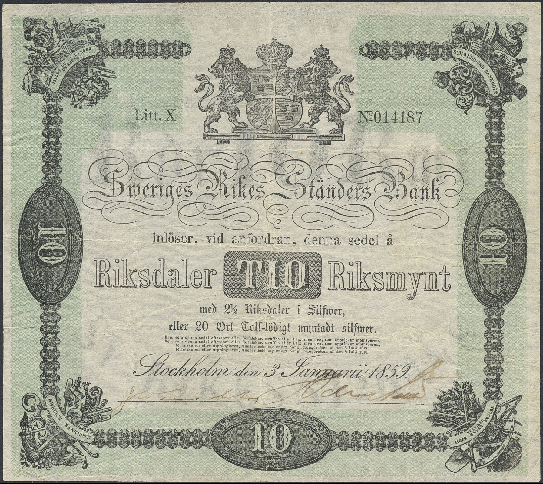 Banknotes, Sweden. SF K1:1, 10 riksdaler riksmynt 1859. Litt X No 014187. Fresh example with good paper quality. 1/1+.
