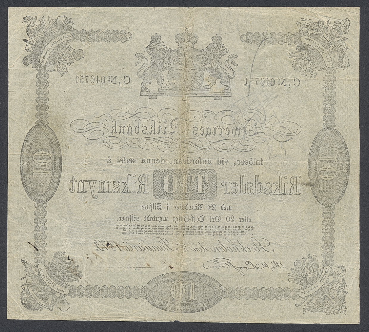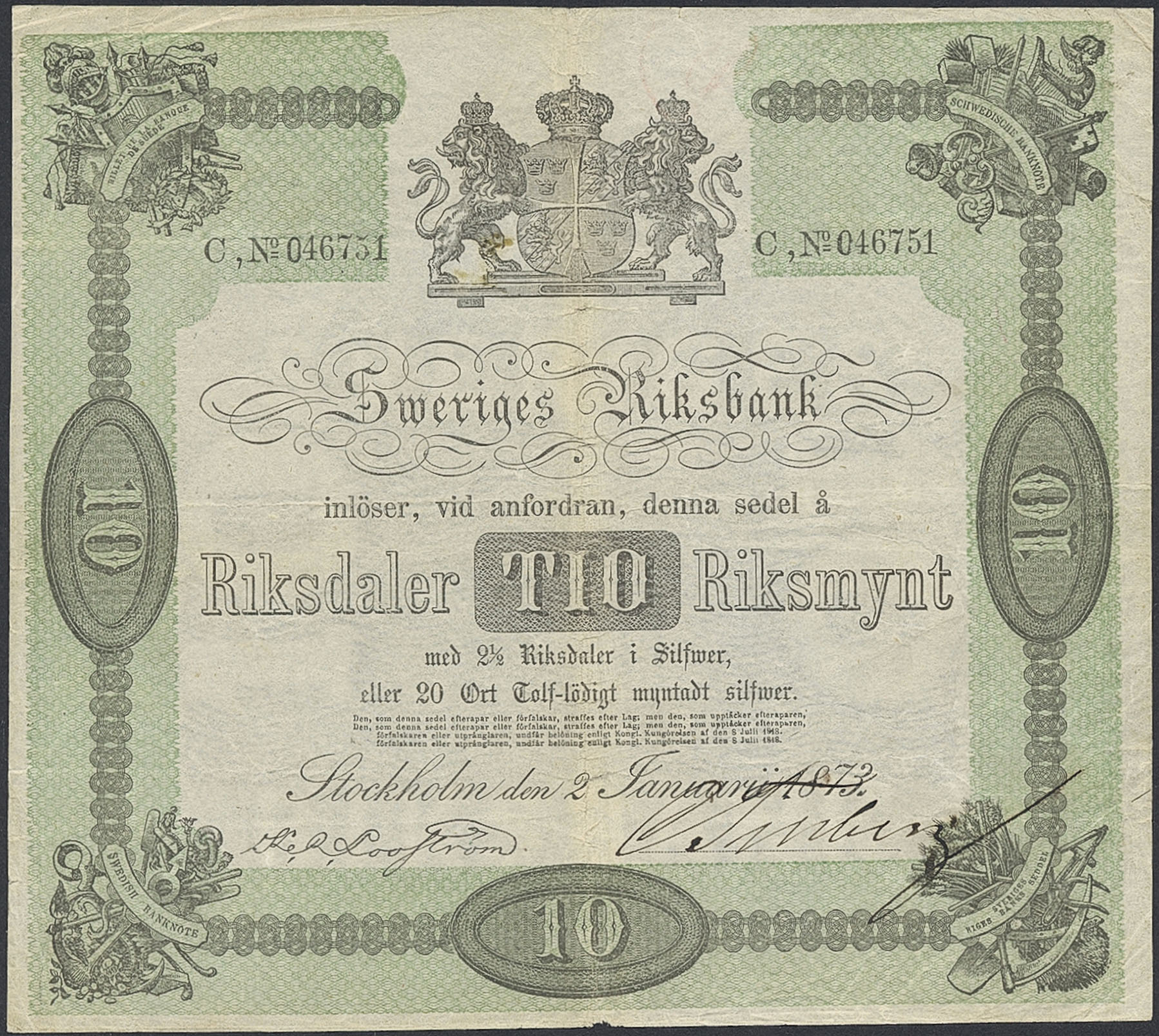 Banknotes, Sweden. SF K3:1, 10 riksdaler riksmynt 1873. Litt C. No 046751. Scarce variety with lower left signature printed. Minor tear in left margin and small holes in centre fold. 1.