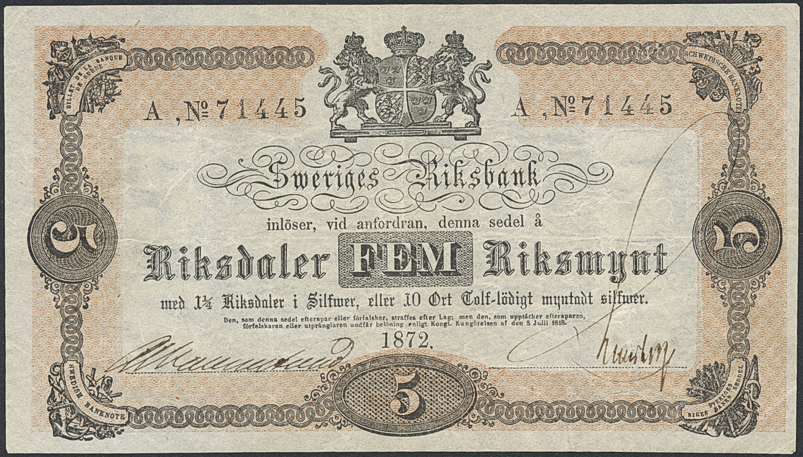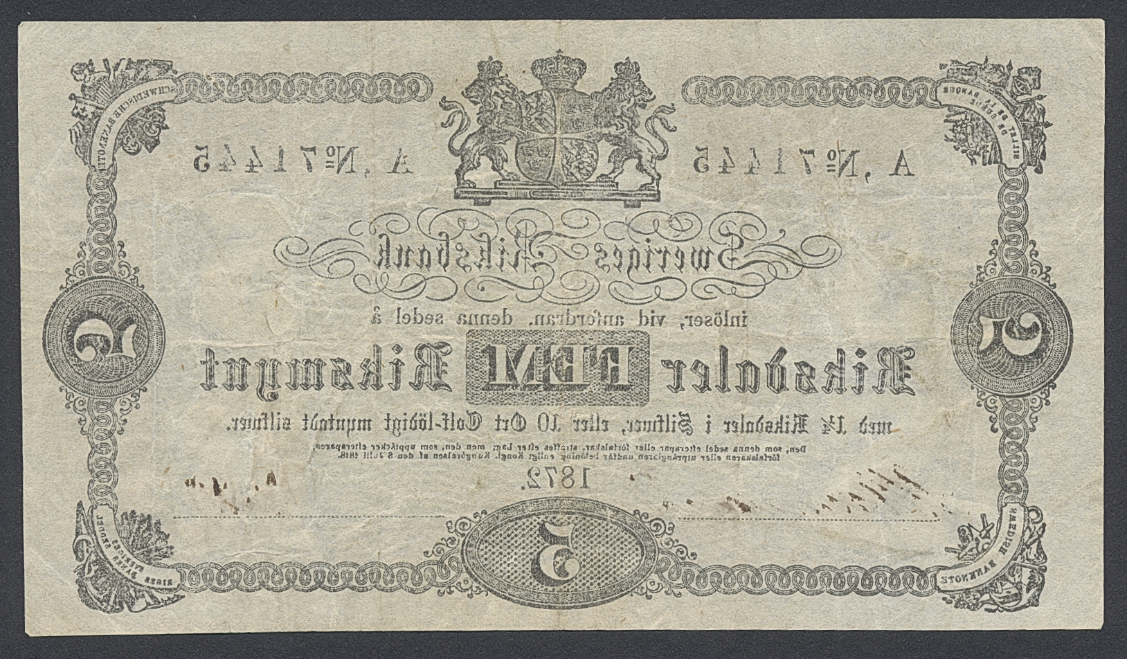 Banknotes, Sweden. SF J3:3, 5 riksdaler riksmynt 1872. A, No 71445. Fresh example with good paper. 1+.