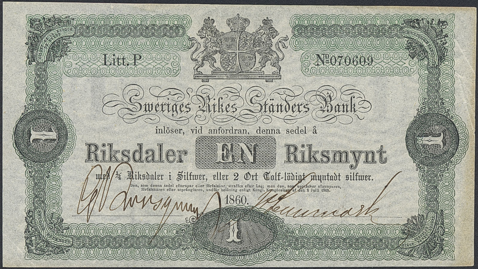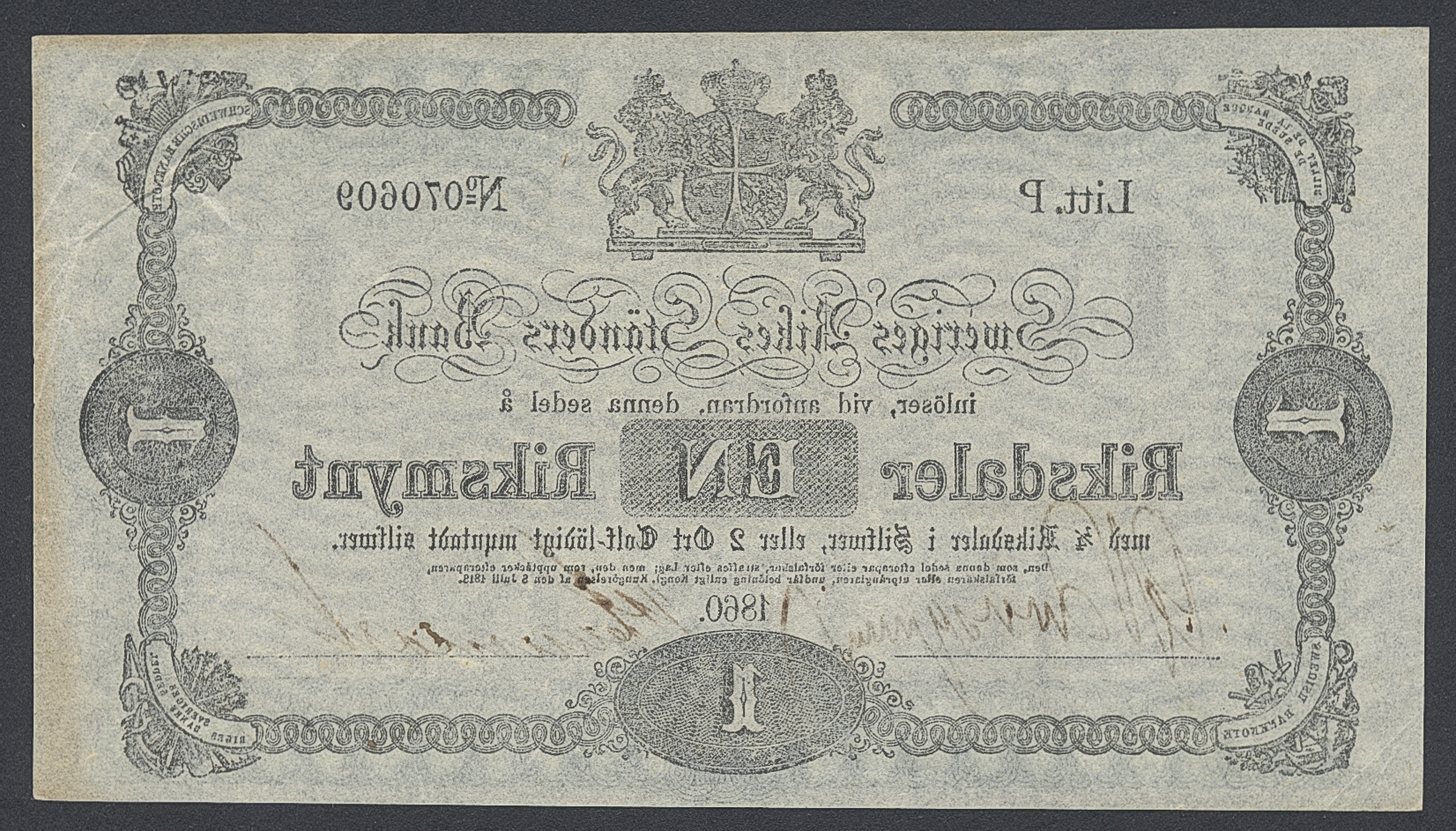 Banknotes, Sweden. SF I1:2, 1 riksdaler riksmynt 1860. Litt P. No 070609. Slight toning in margin. 1+/01.