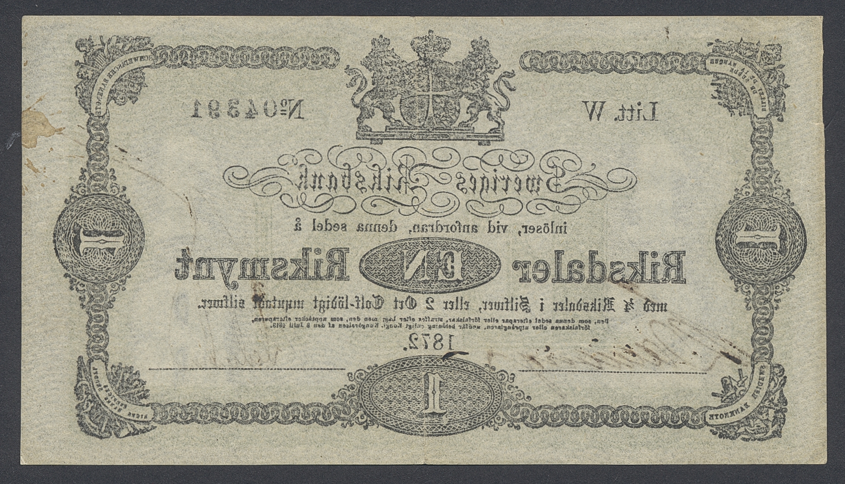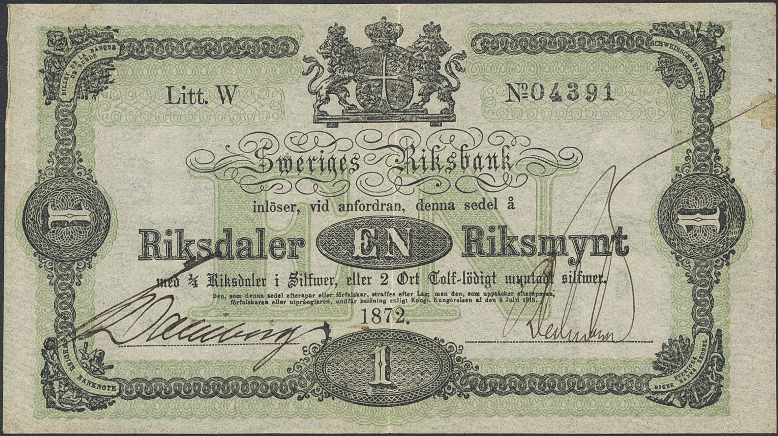 Banknotes, Sweden. SF I3:4, 1 riksdaler riksmynt 1872. Litt W No 04391. 1+/01.