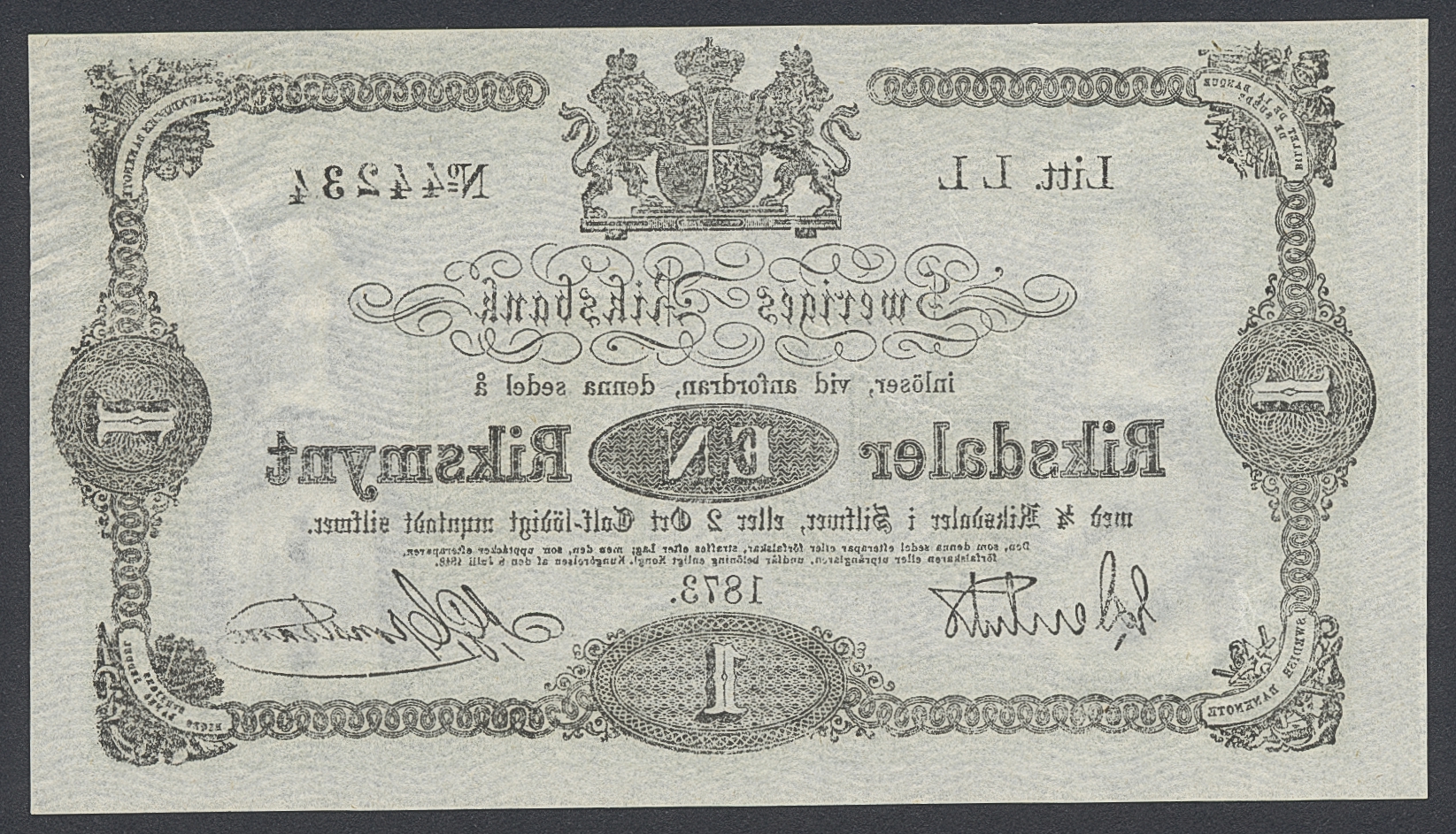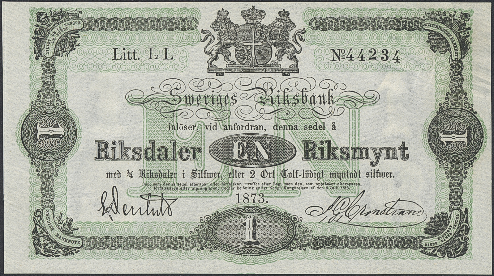 Banknotes, Sweden. SF I5:1, 1 riksdaler riksmynt 1873. Litt Ll. No 44234. Fresh example with only minor handling marks. 01/0.