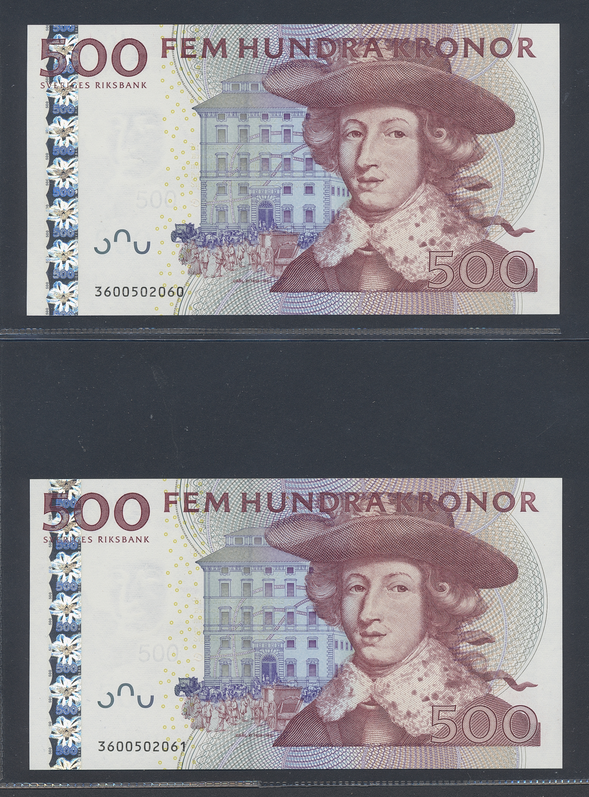 Banknotes, Sweden. SF W3:3, 500 kronor 2003. Two banknotes, No: 3600502060–360050261. 0.