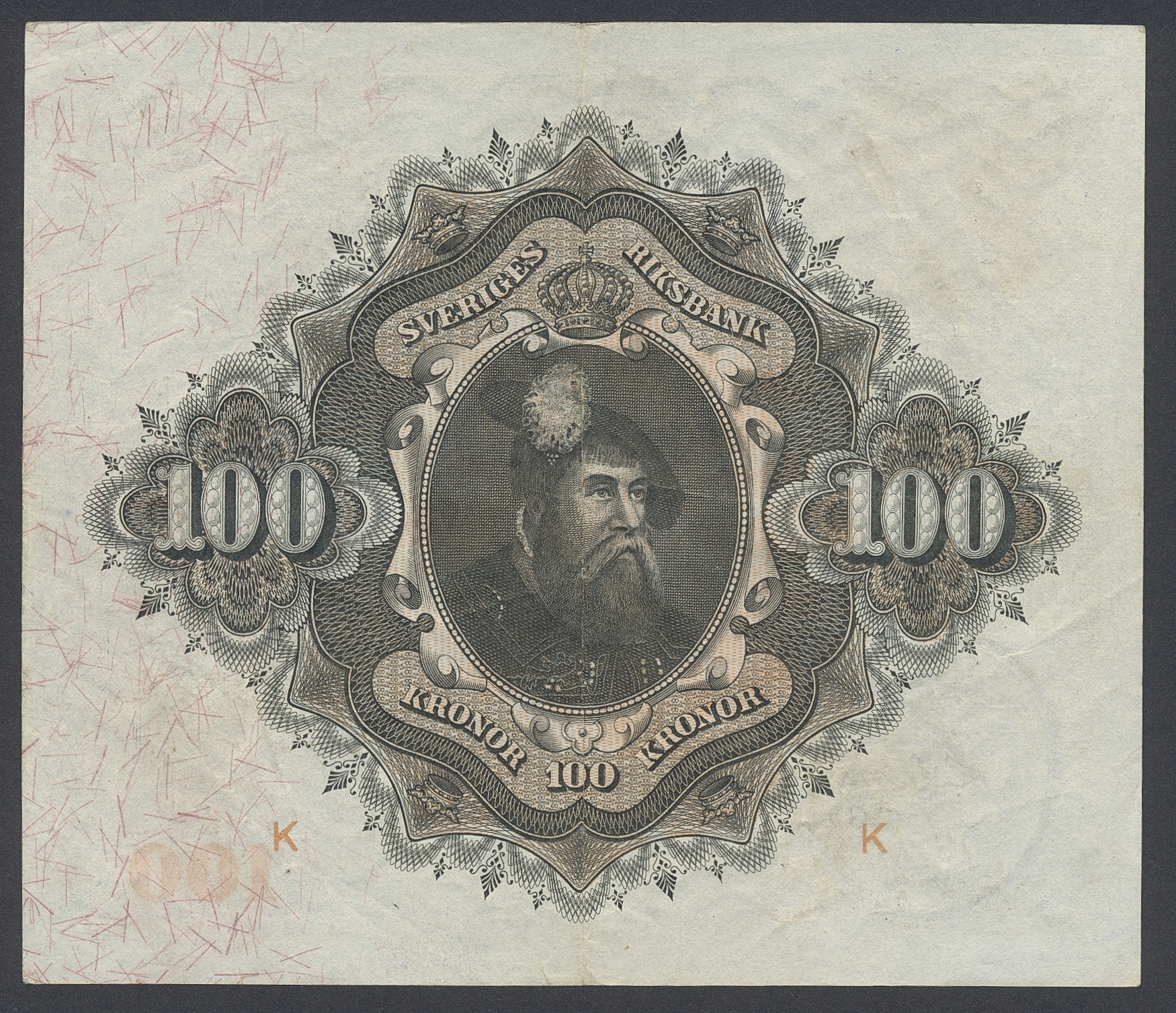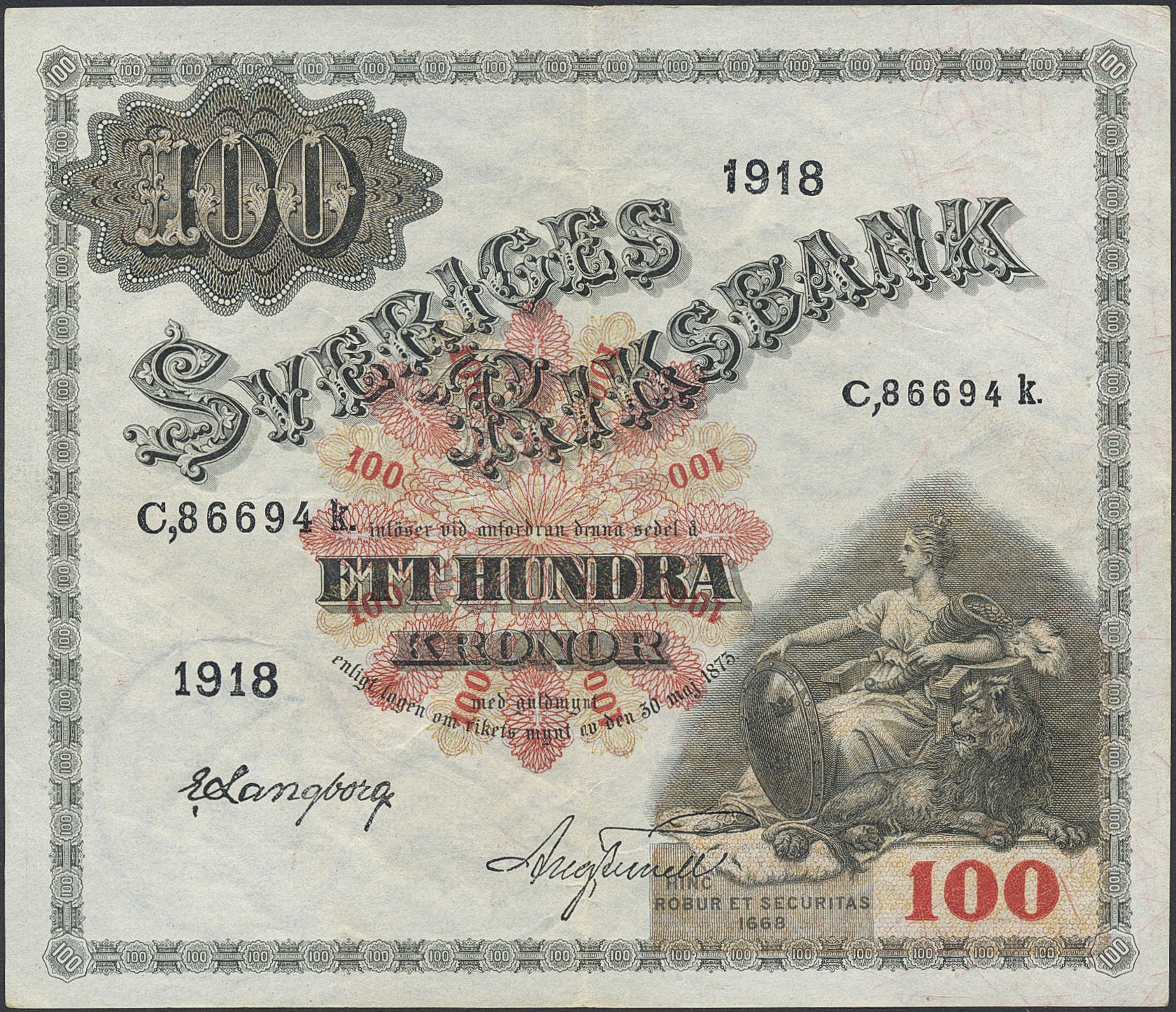Banknotes, Sweden. SF U8:1, 100 kronor 1918. C86694k. Fresh example with centre fold and some handling marks. 1+/01.
