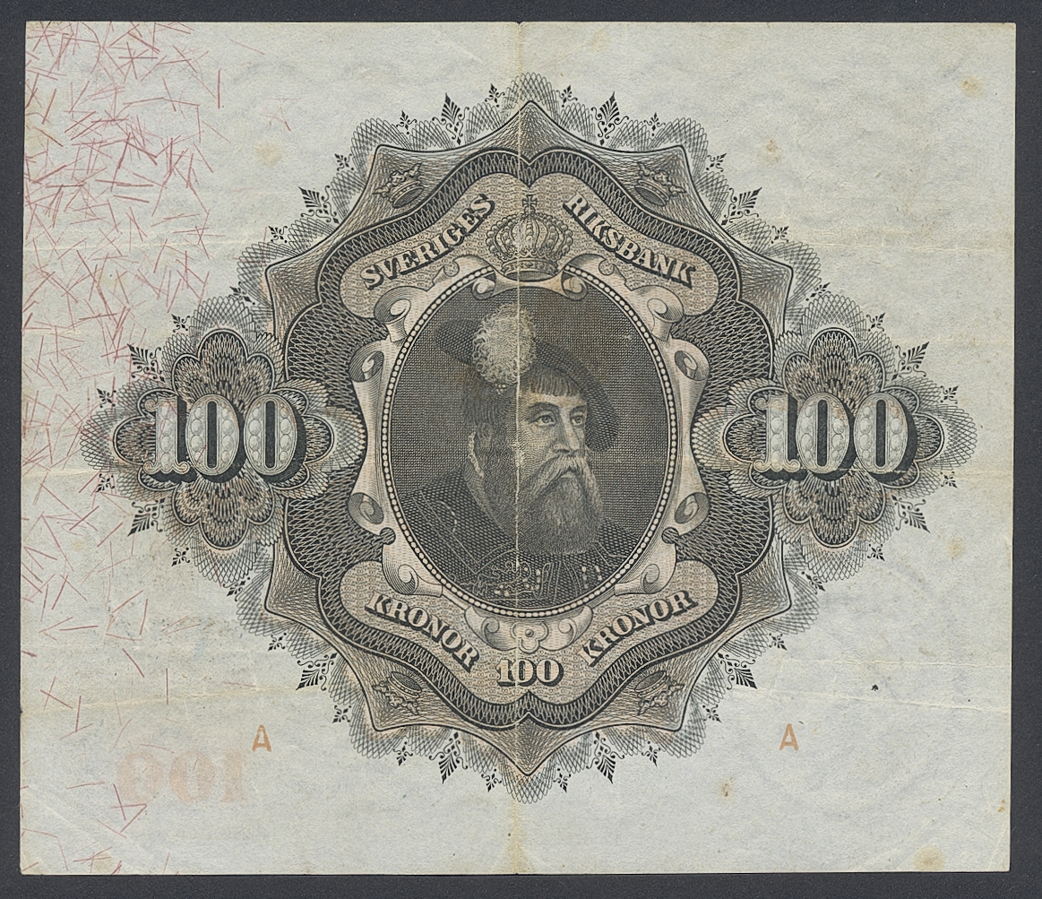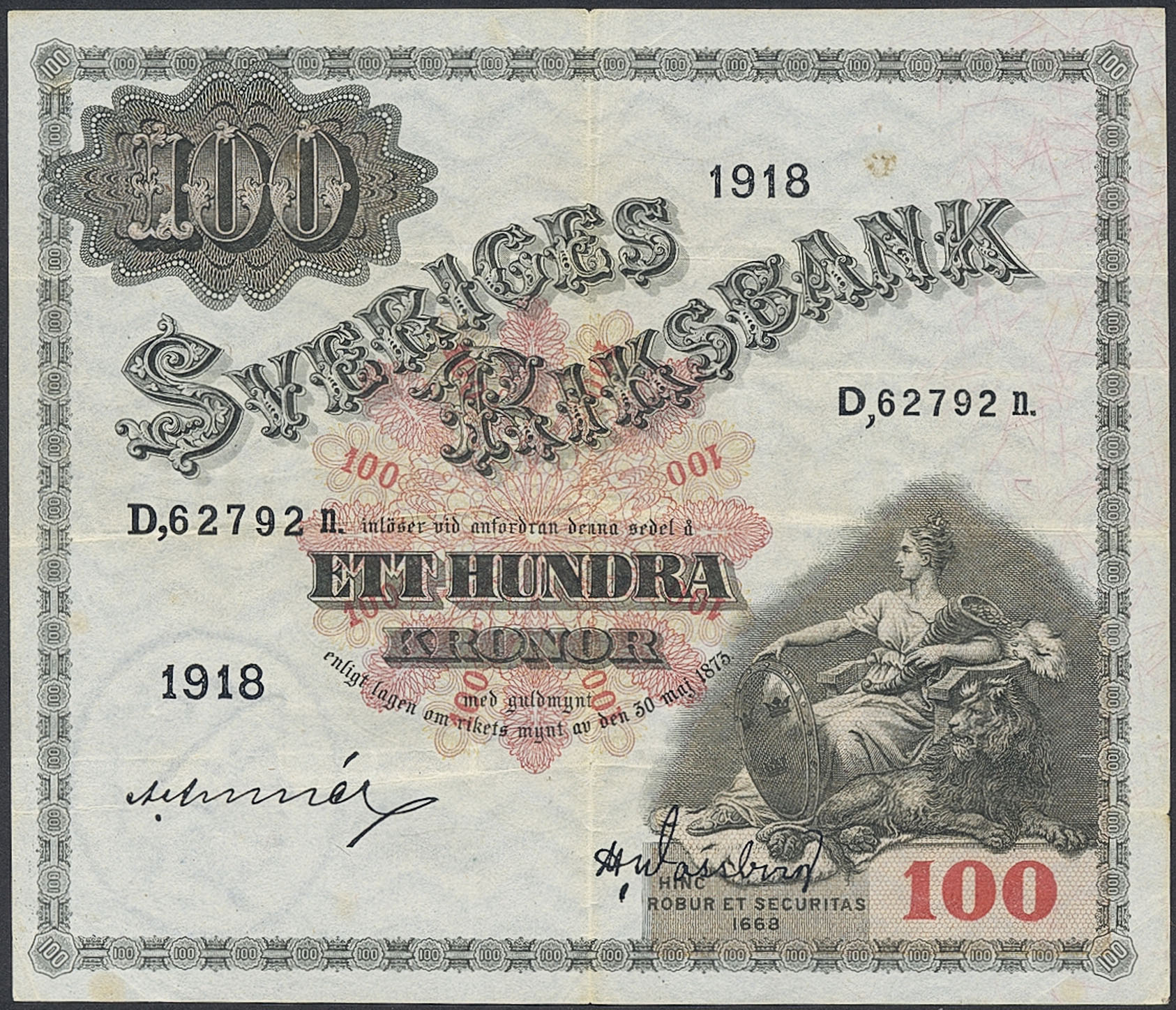 Banknotes, Sweden. SF U8:1, 100 kronor 1918. D,62792n. Ex. Myntkompaniet 3 lot 6679. 1/1+.