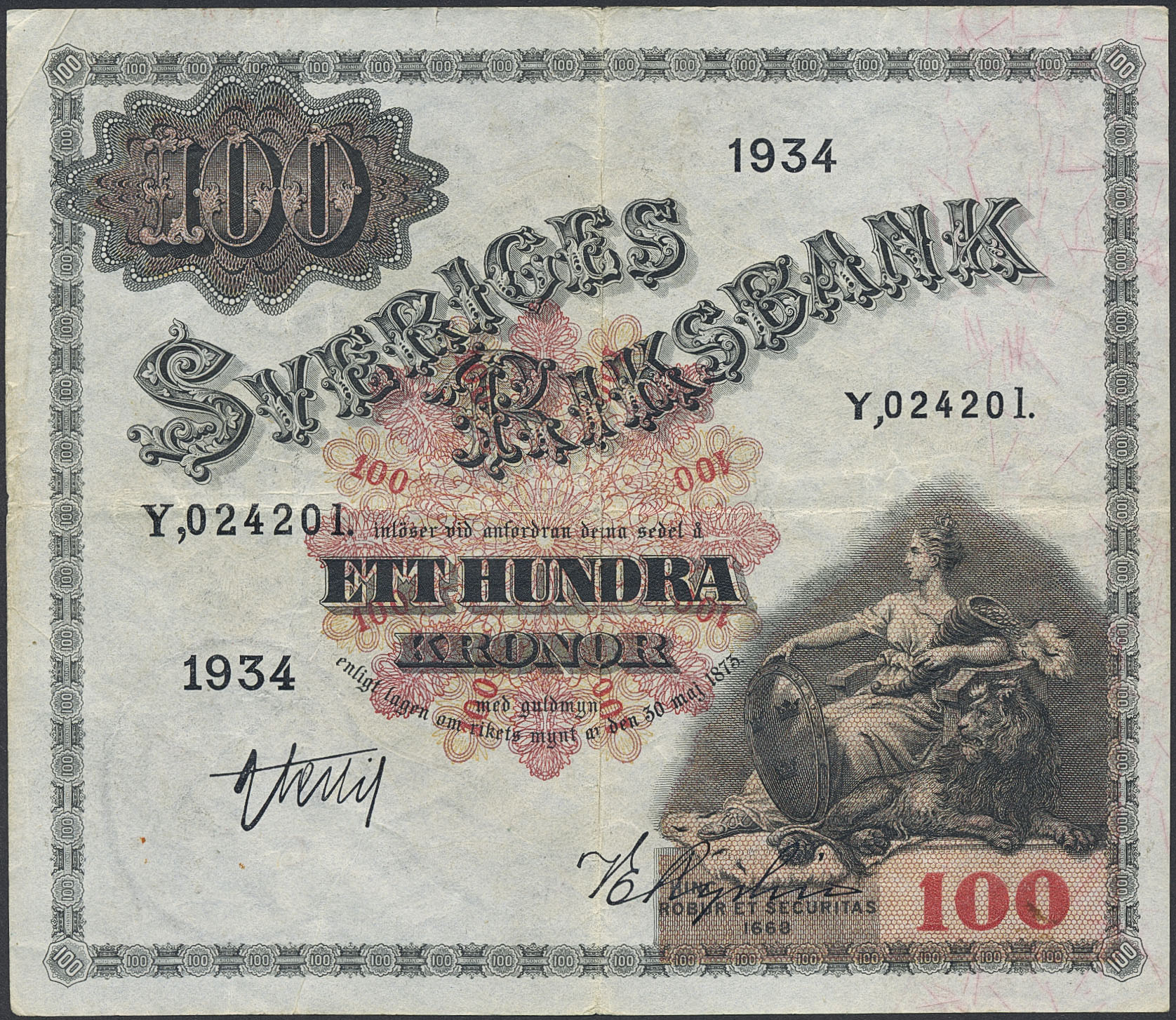 Banknotes, Sweden. SF U8:17, 100 kronor 1934. Y02420l. 1/1+.