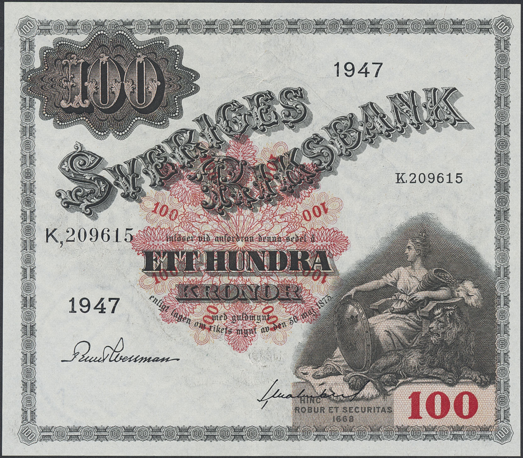 Banknotes, Sweden. SF U10:1, 100 kronor 1947. No: K,209615. 0.