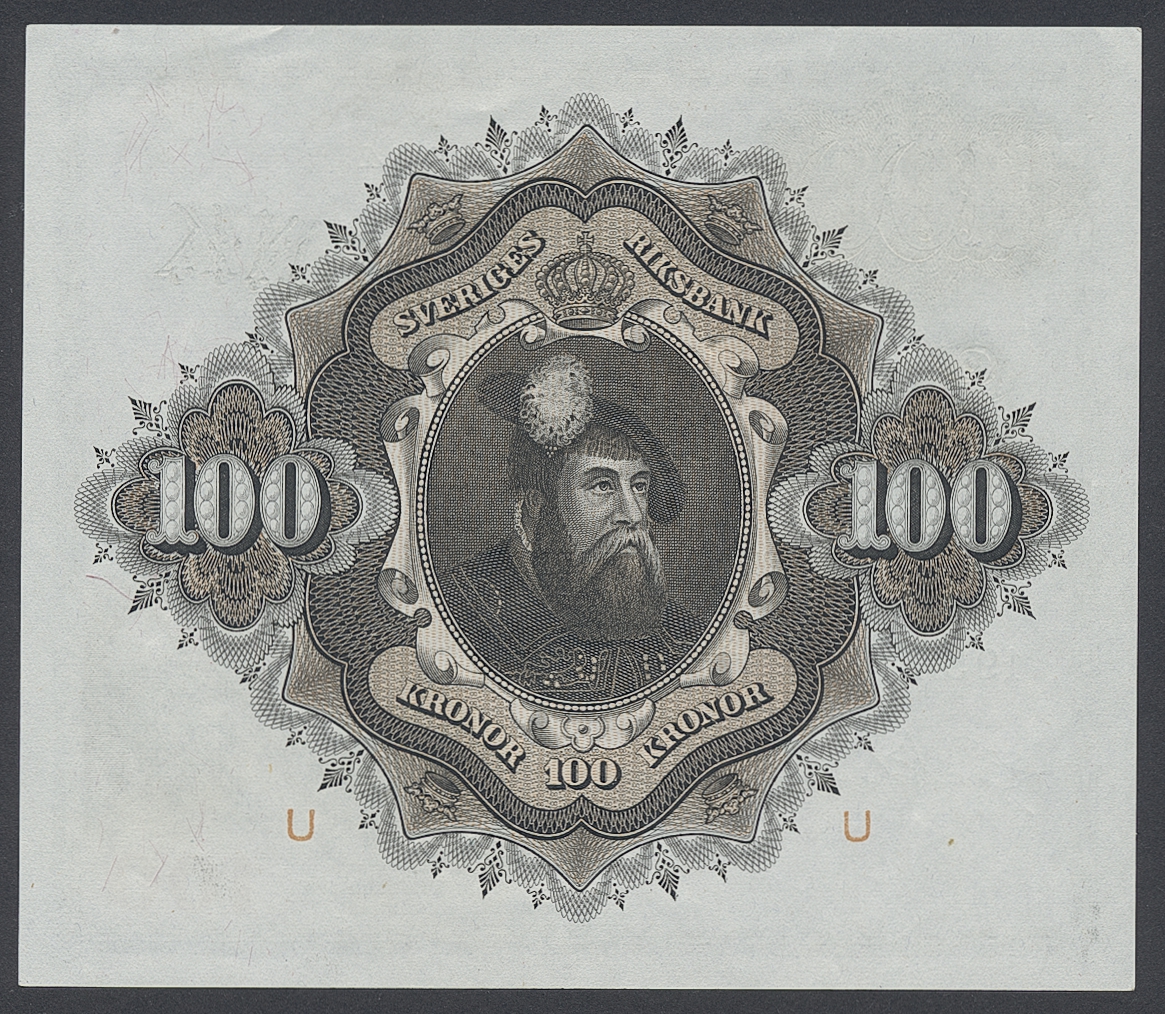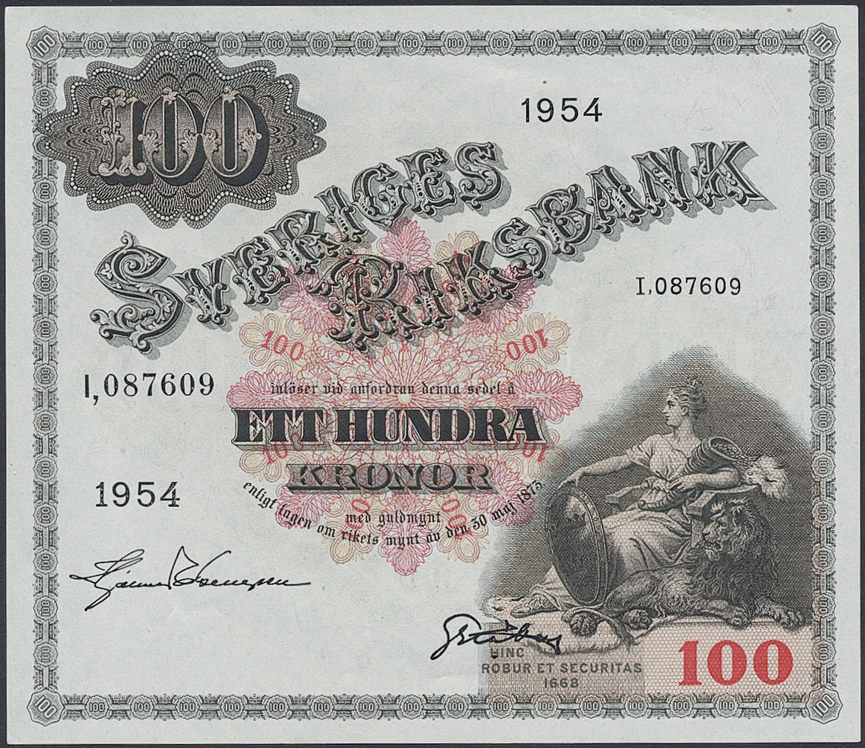 Banknotes, Sweden. SF U10:8, 100 kronor 1954. I087609. Not folded, minor handling marks. 01/0.