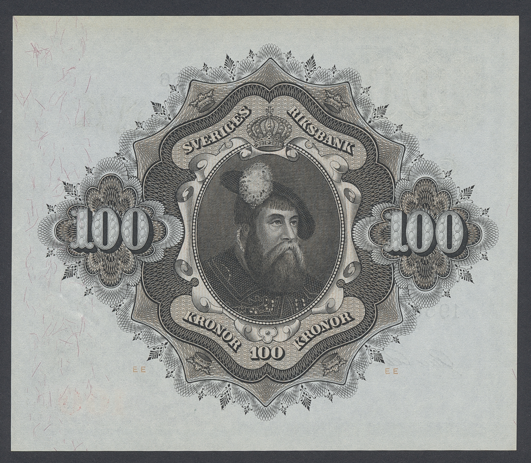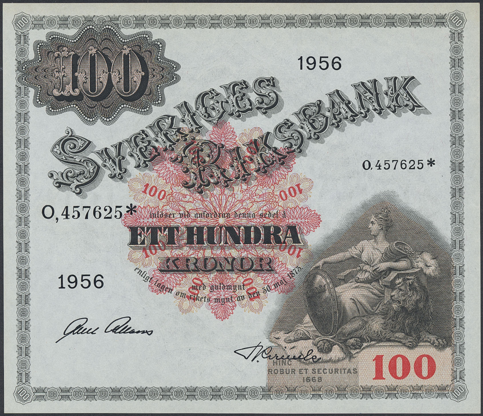 Banknotes, Sweden. SF U10:11, 100 kronor 1956*. O457625*. Replacement note. Slight toning in top margin, else beautiful uncirculated note with minor handling marks. 01/0.