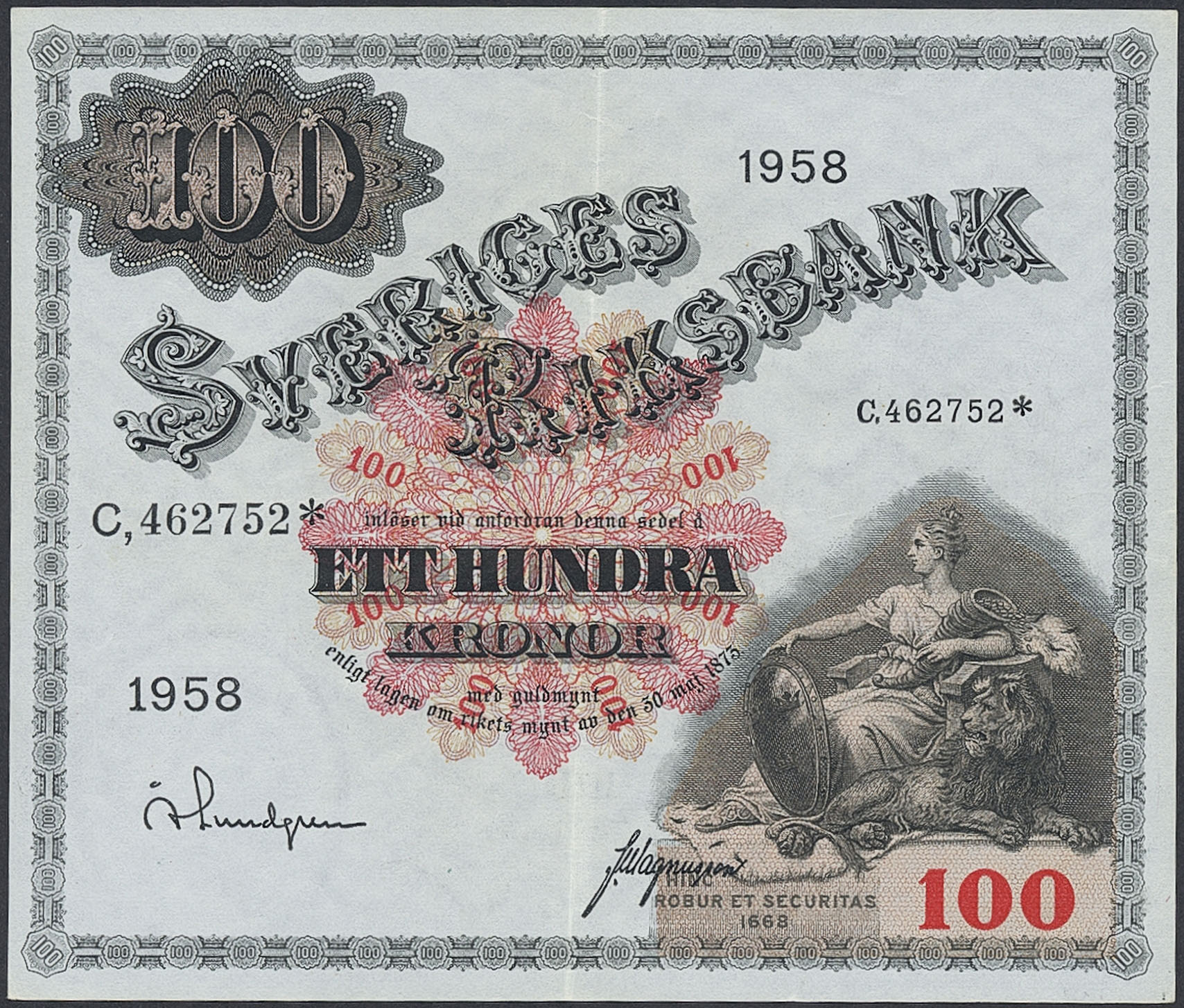 Banknotes, Sweden. SF U10:15, 100 kronor 1958. C,462752*. Replacement note. 01.
