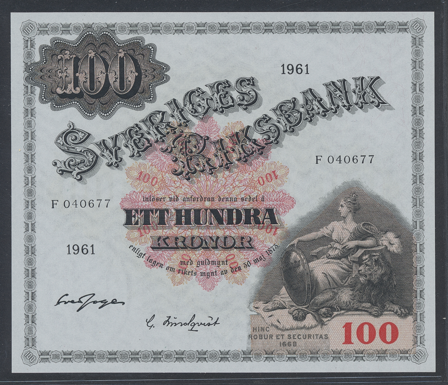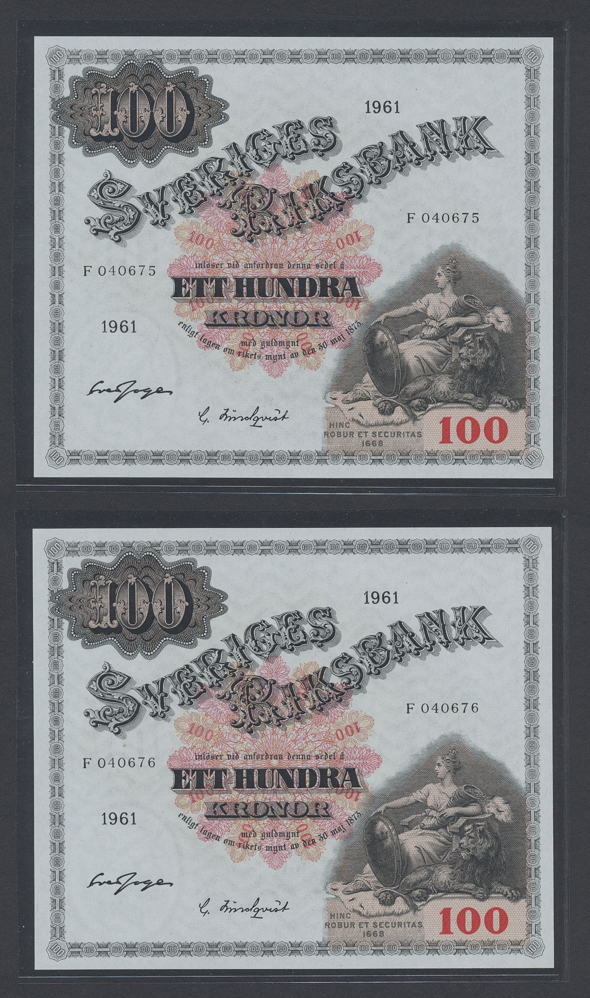 Banknotes, Sweden. SF U11:4, 100 kronor 1961. F040675-77. Three consecutive notes. 0.