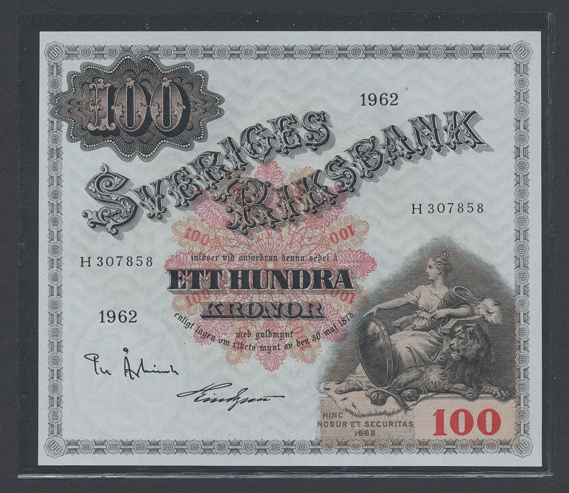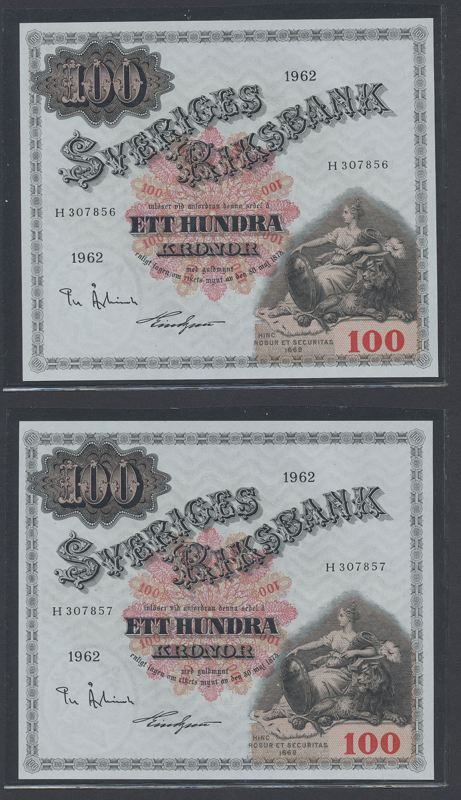 Banknotes, Sweden. SF U11:6, 100 kronor 1962. H307856-58. Three consecutive notes. 0.