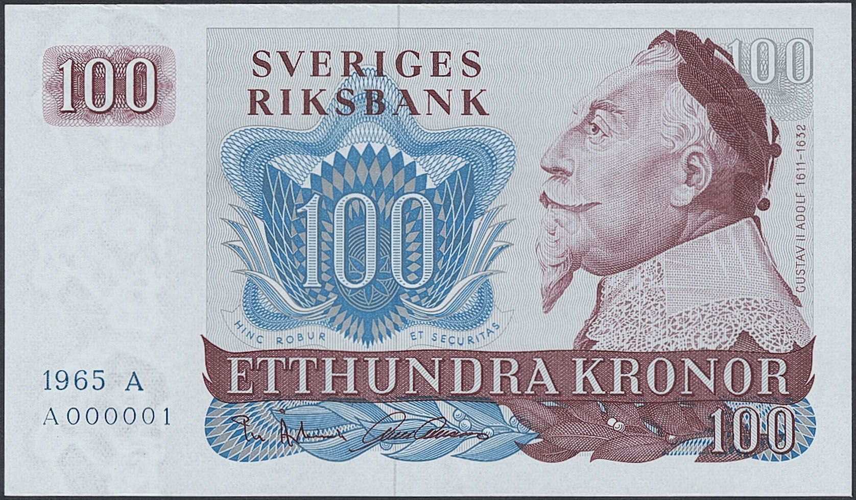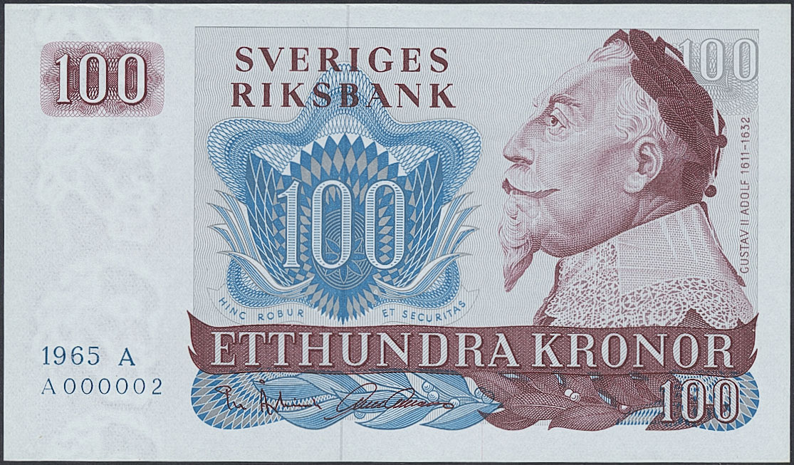 Banknotes, Sweden. SF U12:1, 100 kronor 1965. A A000001-0002. First date, first prefix serial number 1 and 2. Very important first serial number! 0.
