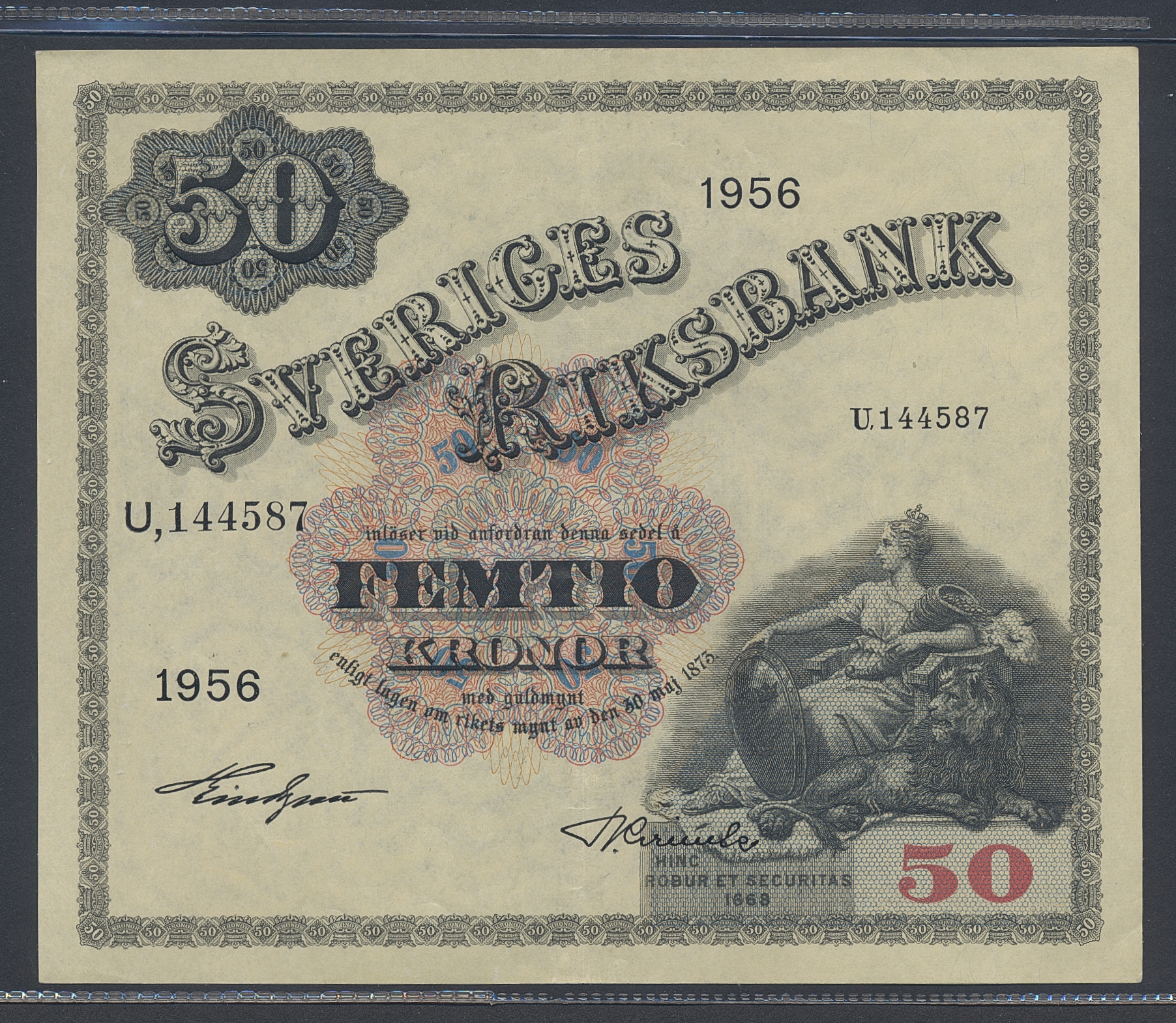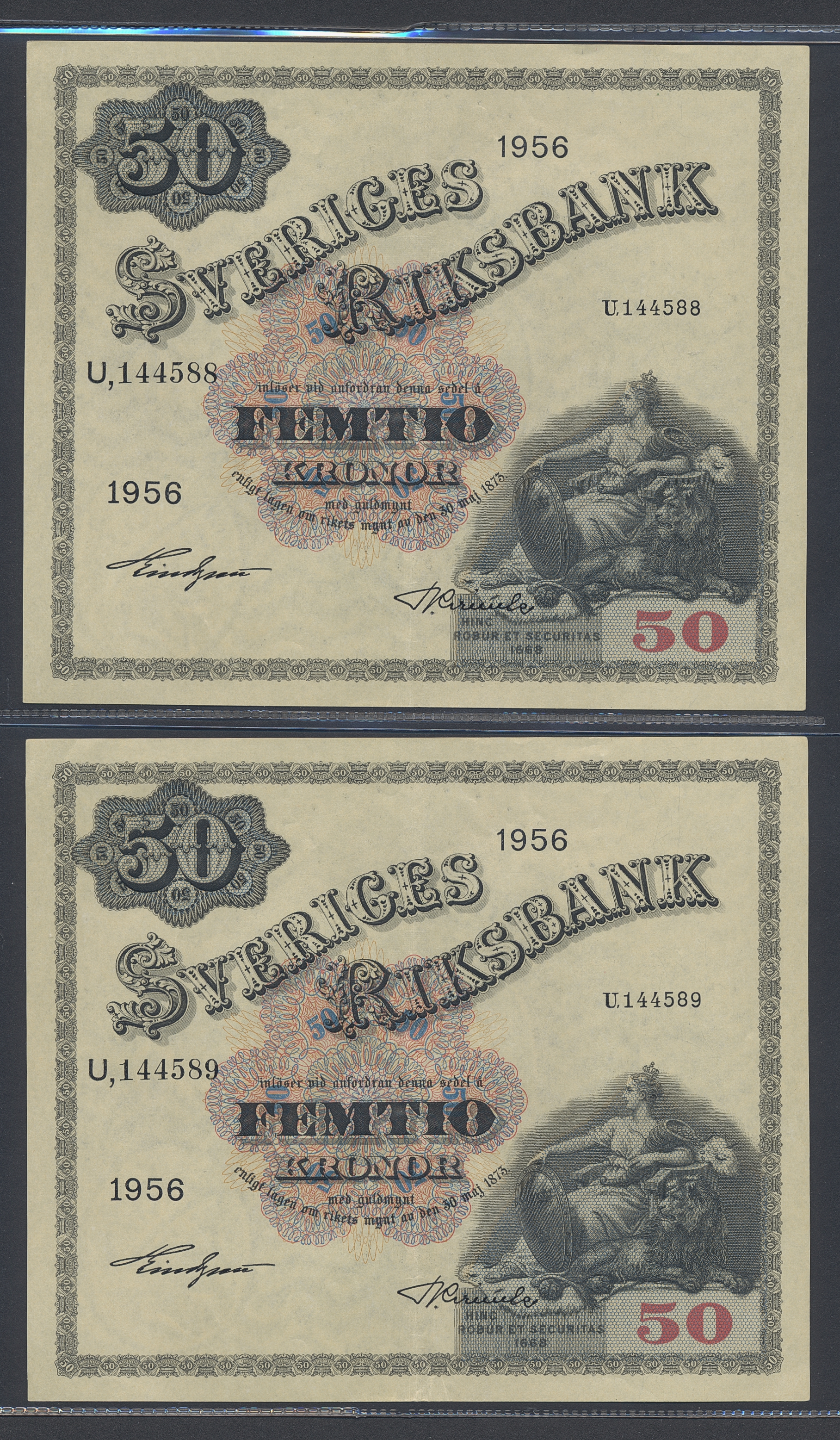 Banknotes, Sweden. SF T9:7, 50 kronor 1956. U144587-89. Three consecutive notes. Centre folded. 01.