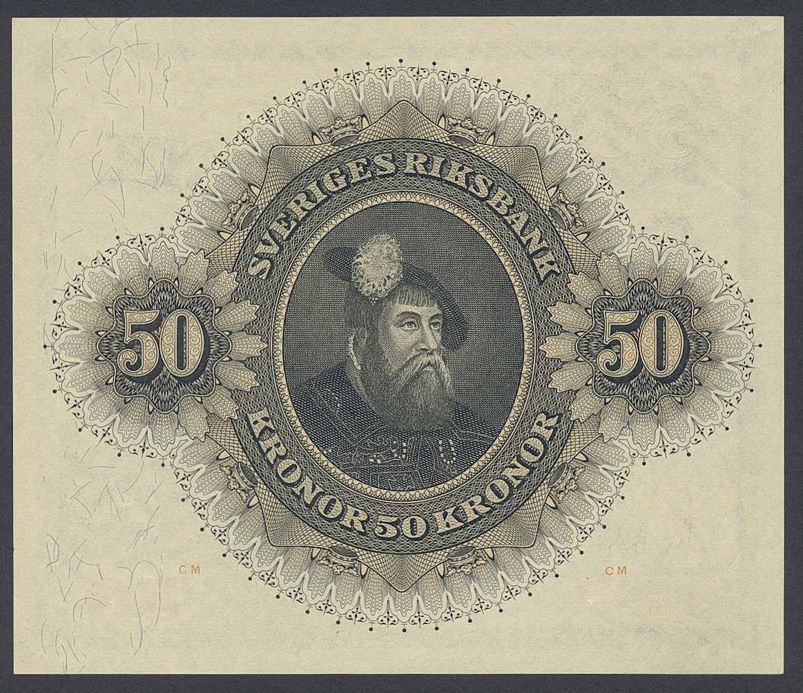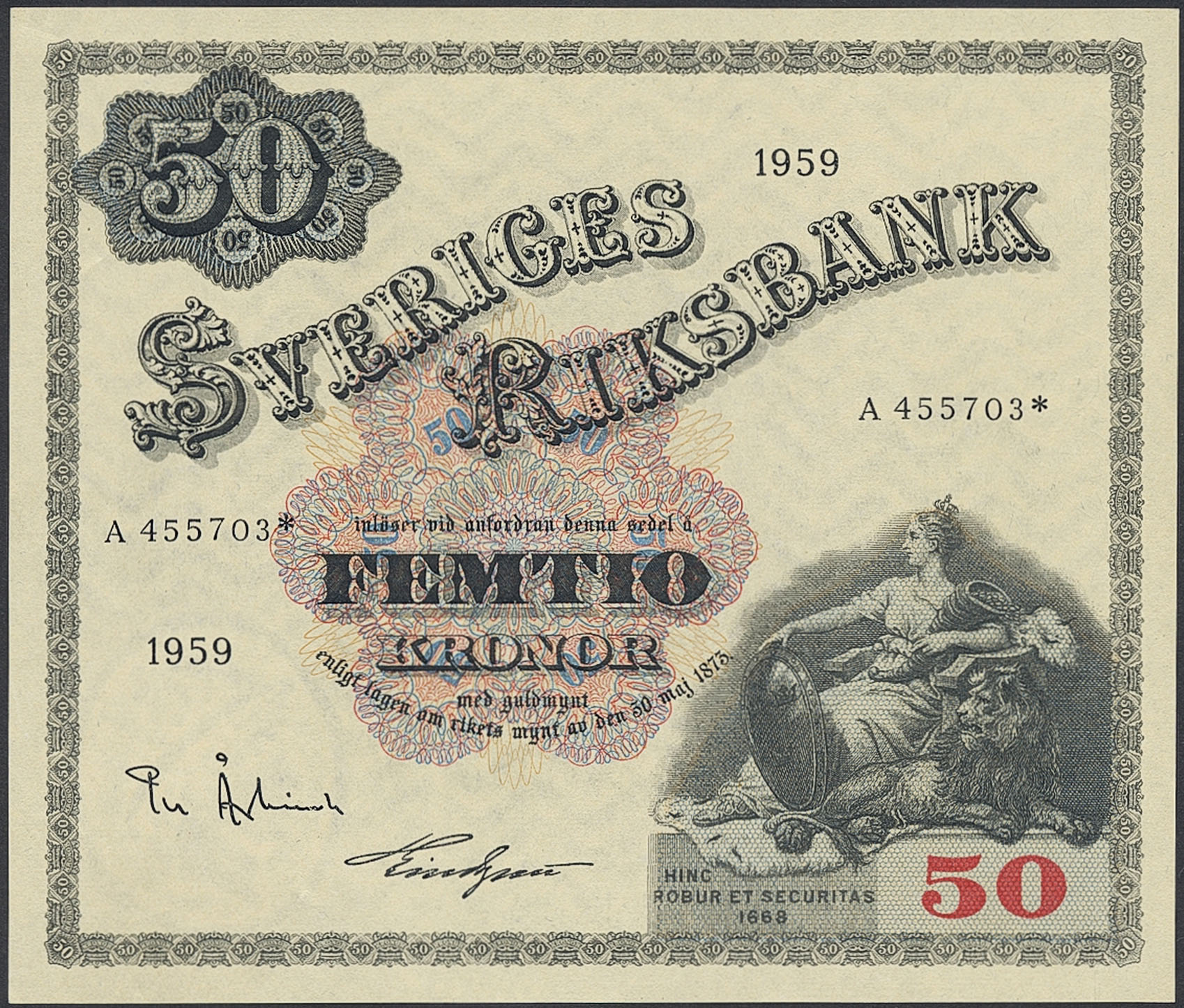 Banknotes, Sweden. SF T10:2, 50 kronor 1959. A 455703*. Replacement note. Light handling marks. Ex. Myntkompaniet 3 lot 6756. 01/0.