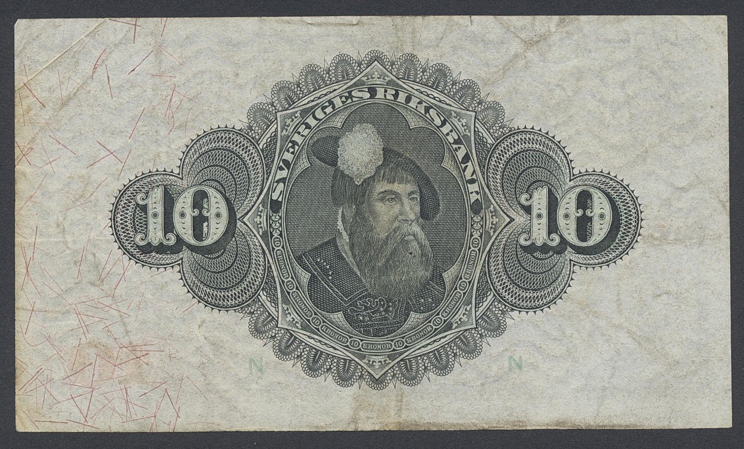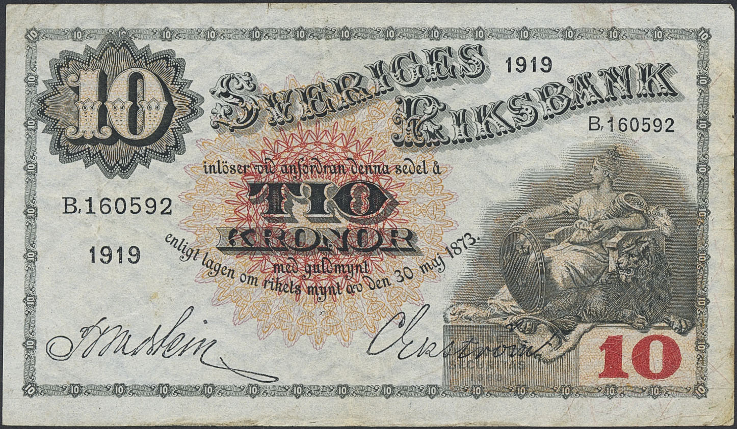 Banknotes, Sweden. SF R5:2, 10 kronor 1919. B160592. Minor pinhole in centre. 1/1+.