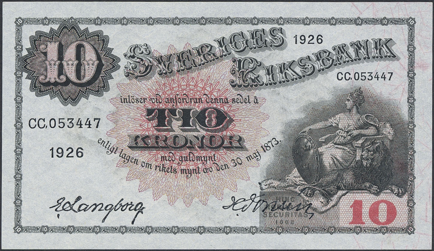 Banknotes, Sweden. SF R5:9, 10 kronor 1926. CC053447. Not folded. 01/0.