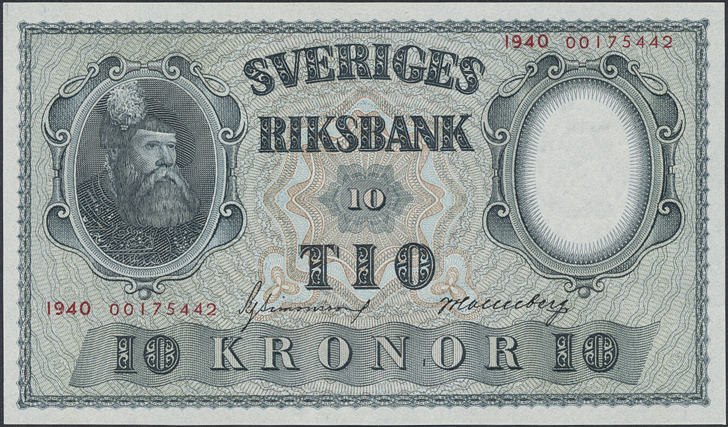 Banknotes, Sweden. SF R6:1, 10 kronor 1940. 00175442. Key date in excellent condition. 0.