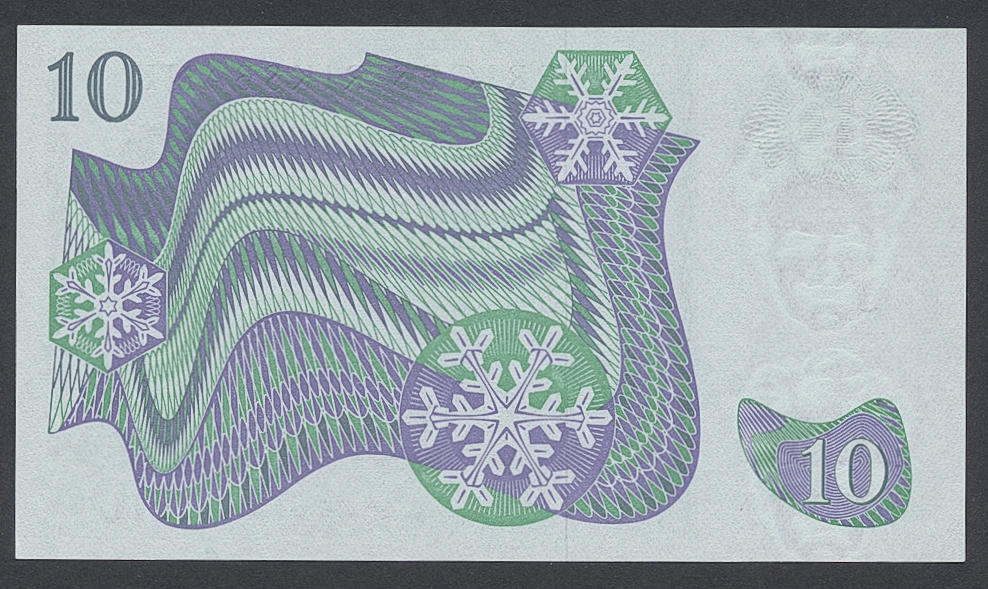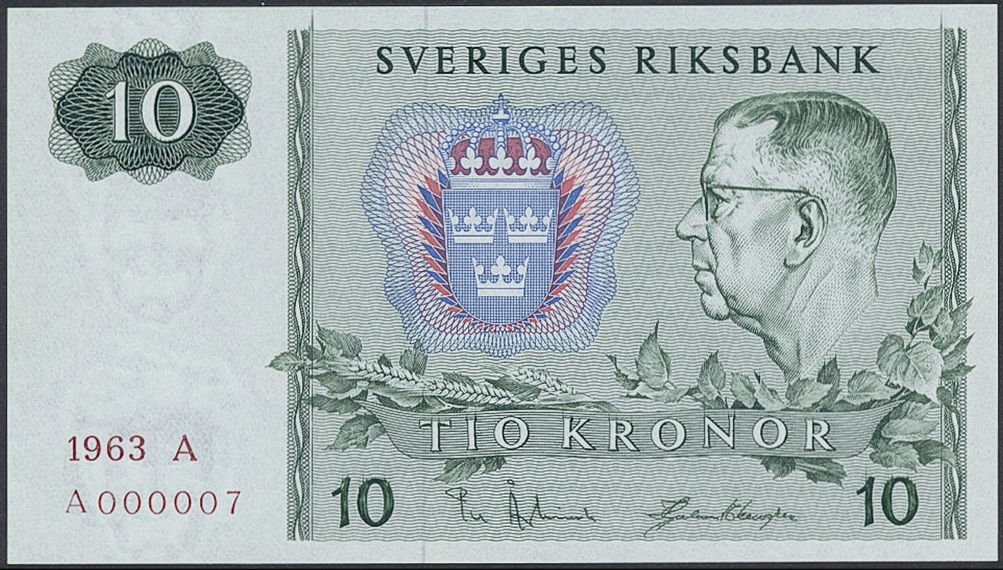Banknotes, Sweden. SF R8:1, 10 kronor 1963. A A000007. First date, first prefix serial number 7. Not folded, minor handling marks. 01/0.