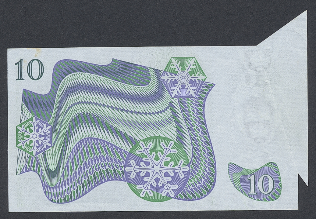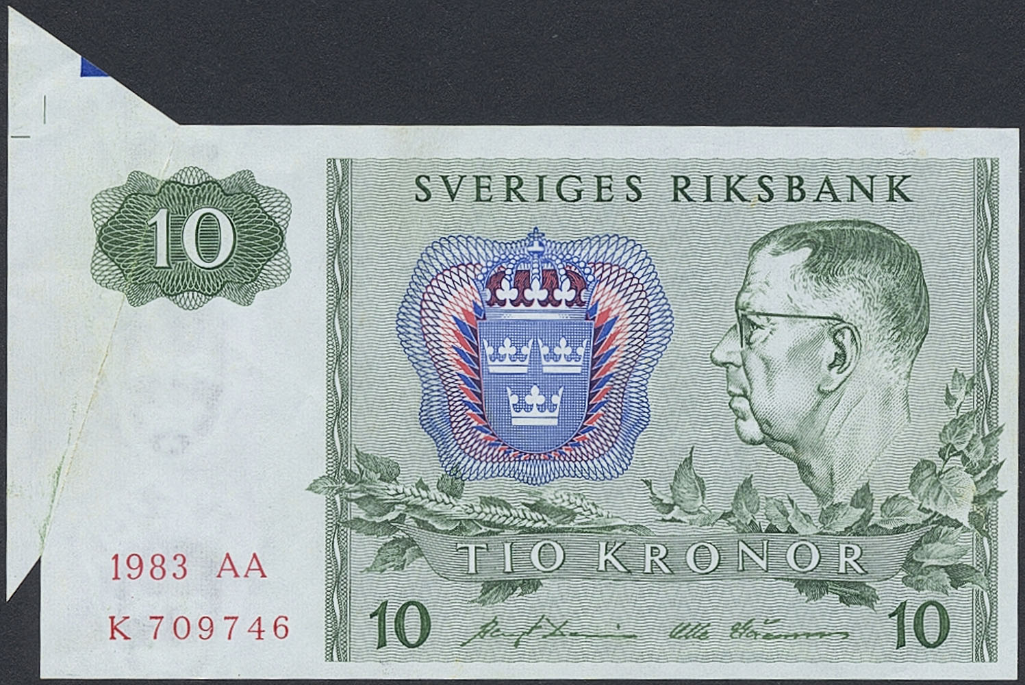 Banknotes, Sweden. SF R8:24, 10 kronor 1983. AA K 709746. Miscut due to folded paper at printing. Ex MISAB 12 lot 340. 01.