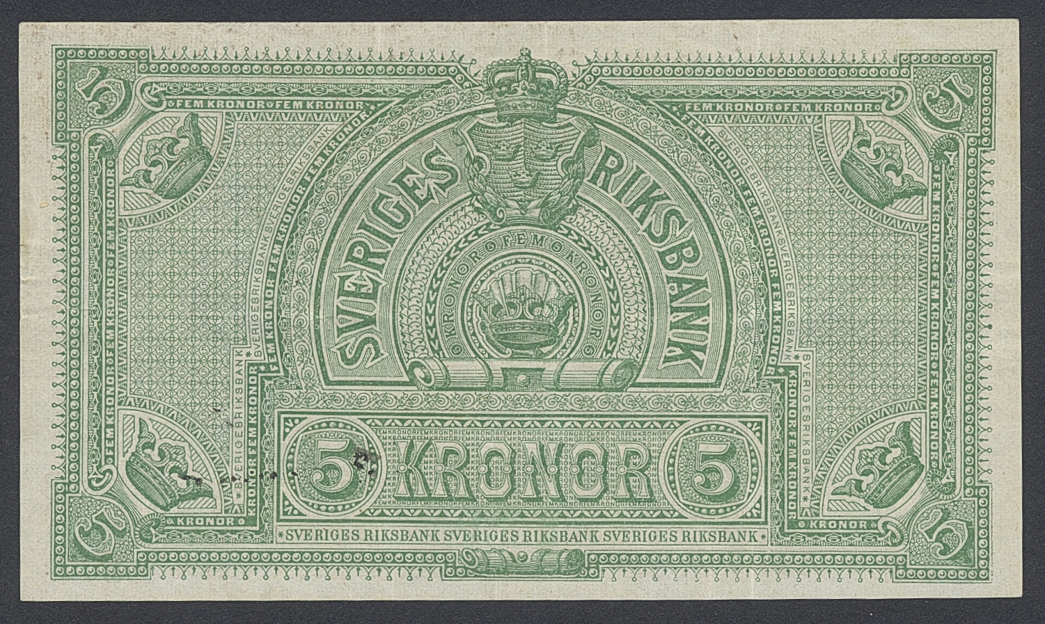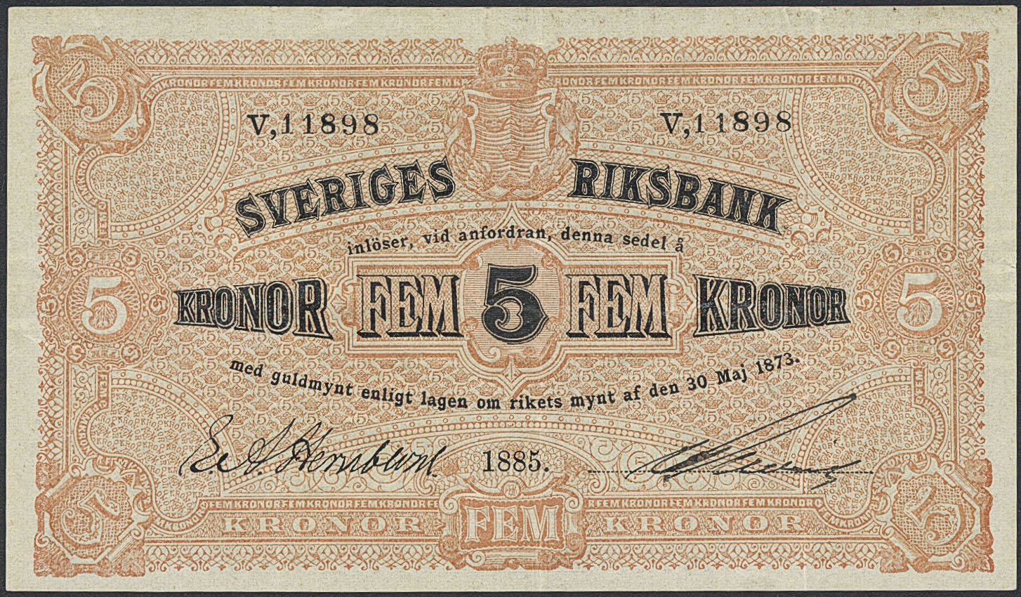 Banknotes, Sweden. SF Q3:7, 5 kronor 1885. V,11898. Fresh example. 1/1+.