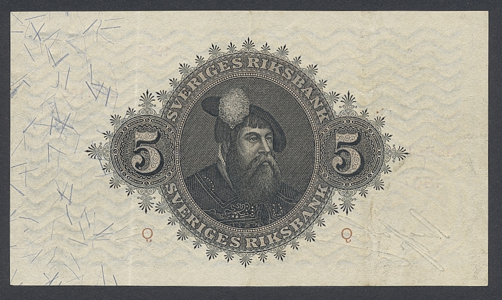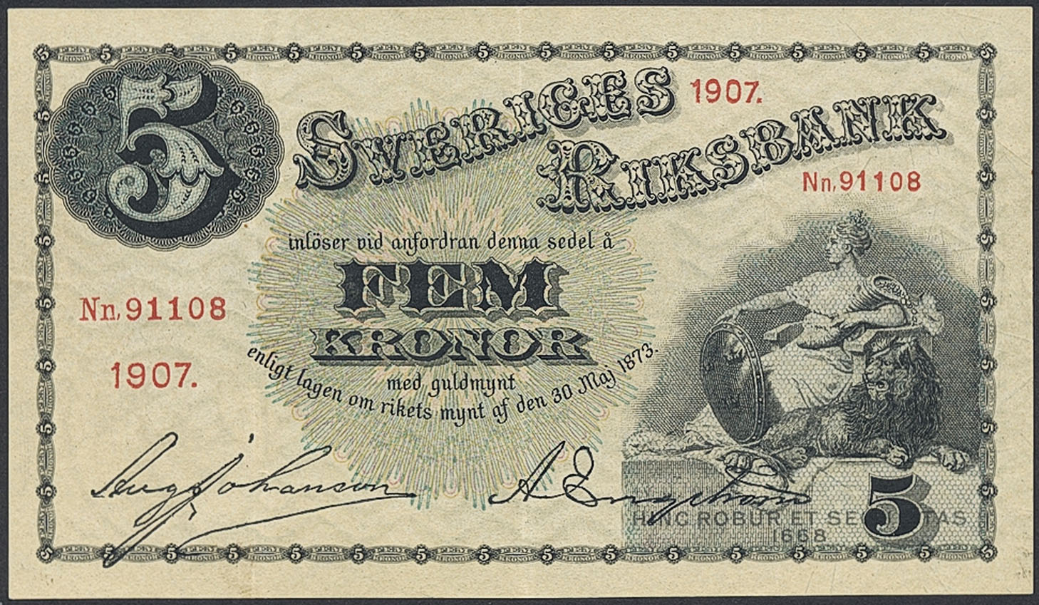 Banknotes, Sweden. SF Q6:2, 5 kronor 1907. Nn91108. Pressed. 1+.
