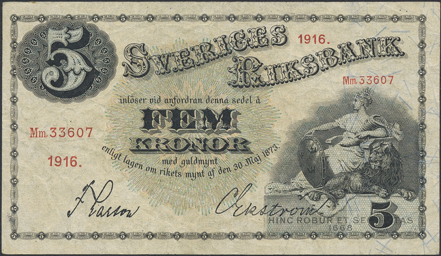Banknotes, Sweden. SF Q6:11, 5 kronor 1916. Mm 33607. 1+.