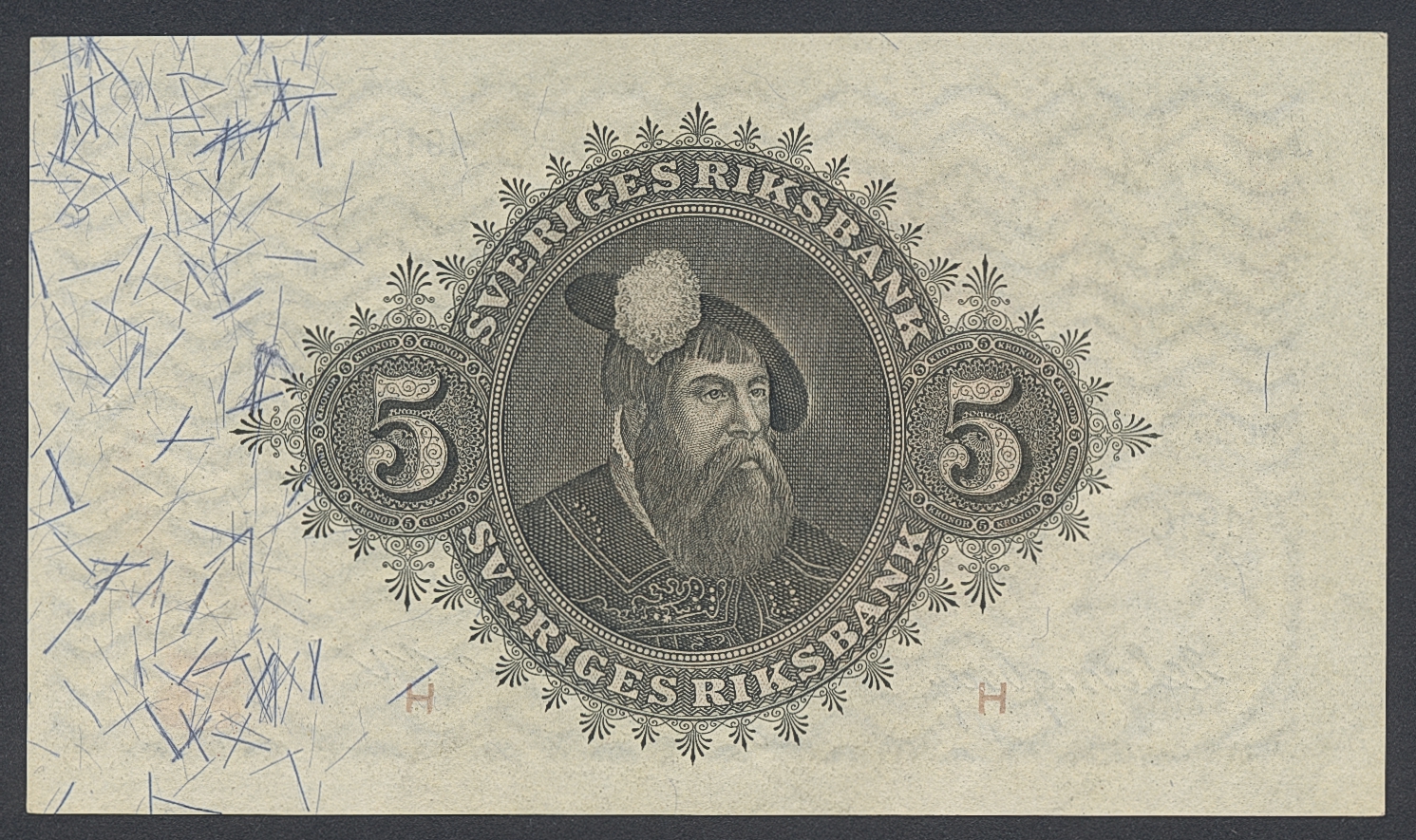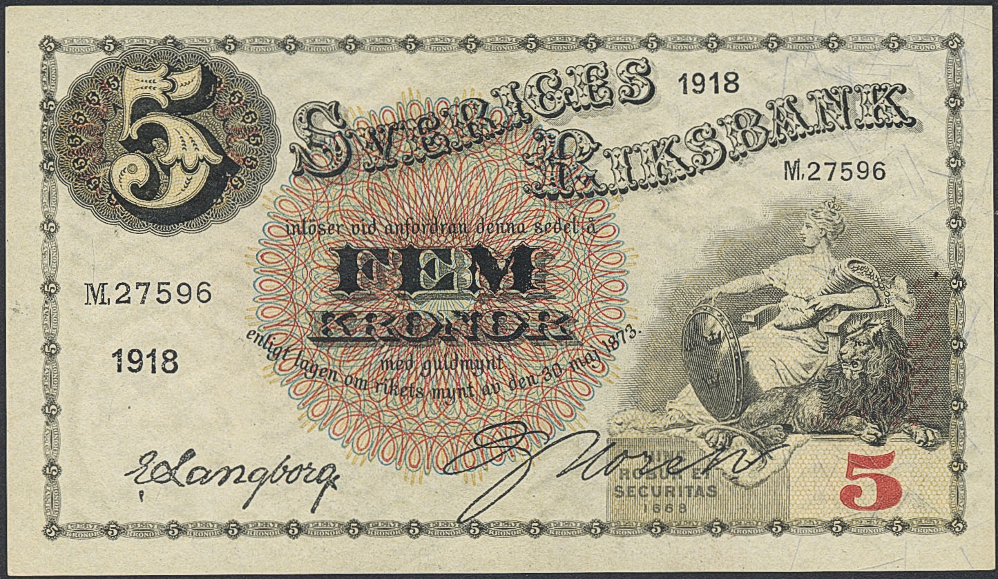 Banknotes, Sweden. SF Q7:1, 5 kronor 1918. M 27596. Pressed. Ex. MISAB 5 lot 61. 01/0.