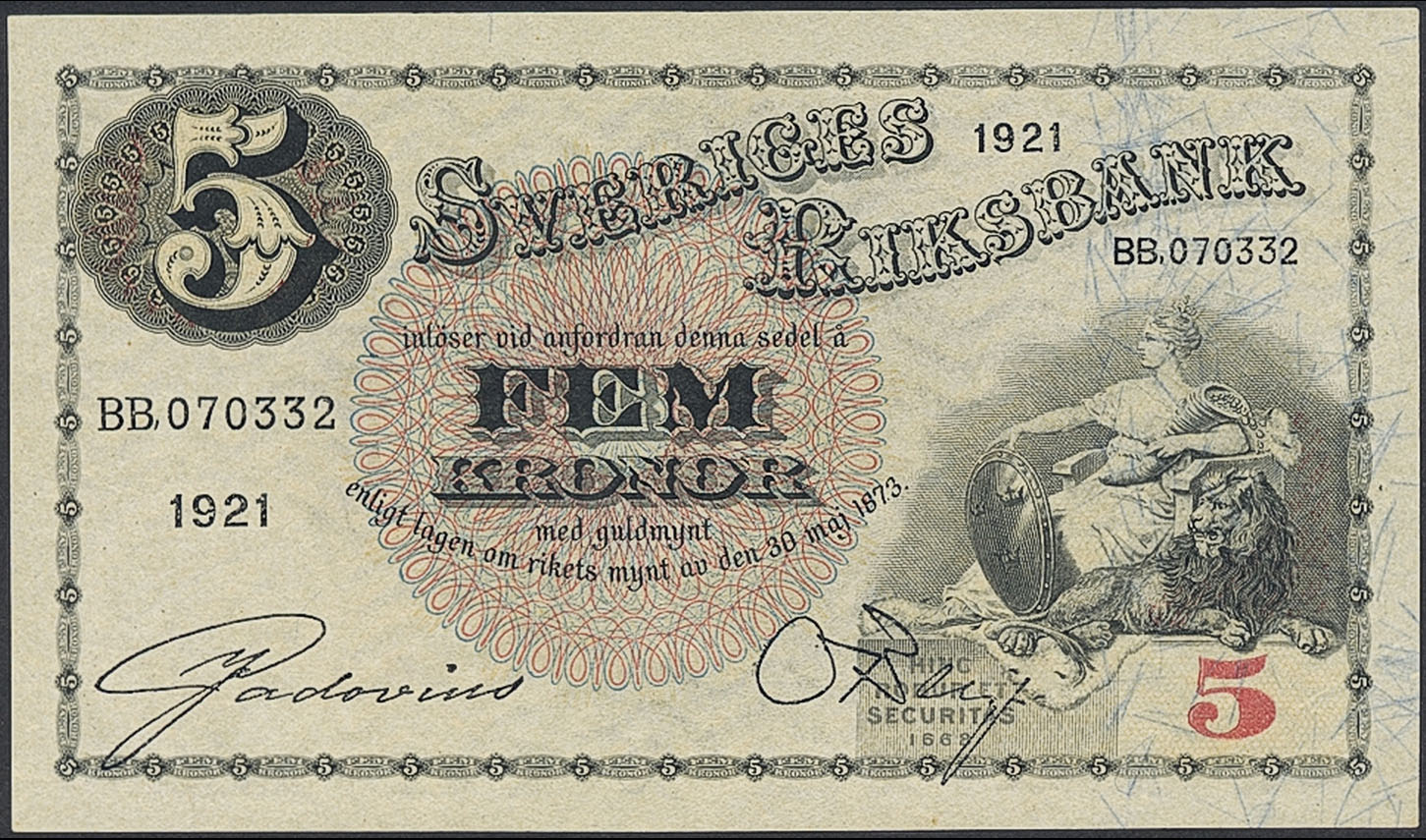 Banknotes, Sweden. SF Q7:4, 5 kronor 1921. BB070332. Ex Myntkompaniet 3 lot 6824. 01/0.
