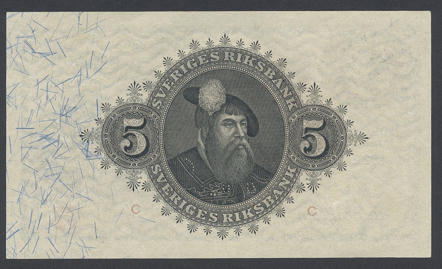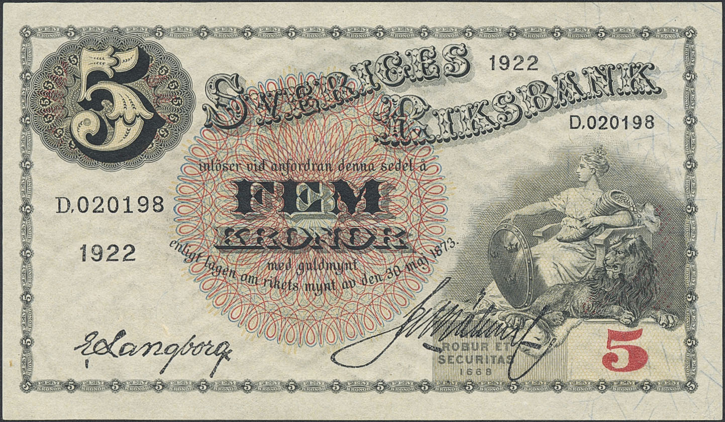 Banknotes, Sweden. SF Q7:5, 5 kronor 1922. D020198. Fresh note without folds. Slight handling marks. 01/0.