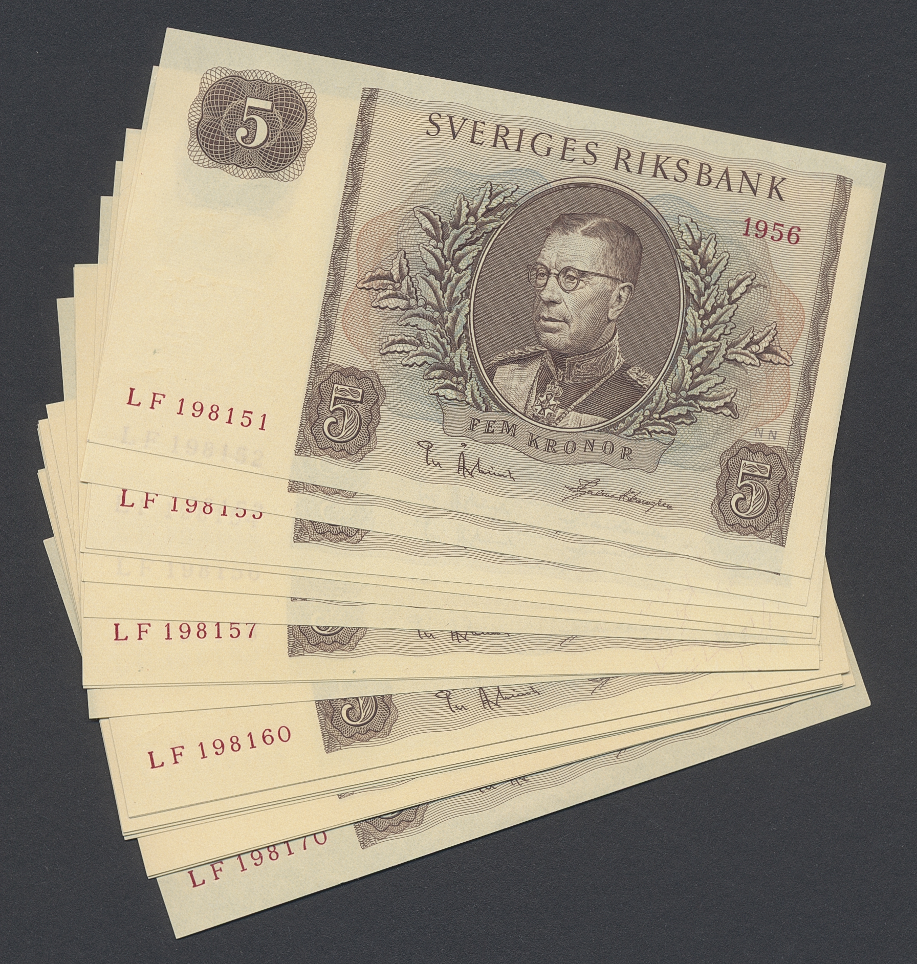 Banknotes, Sweden. SF Q9:3, 5 kronor 1956. 20 consecutive notes LF198151-LF198170. 0.