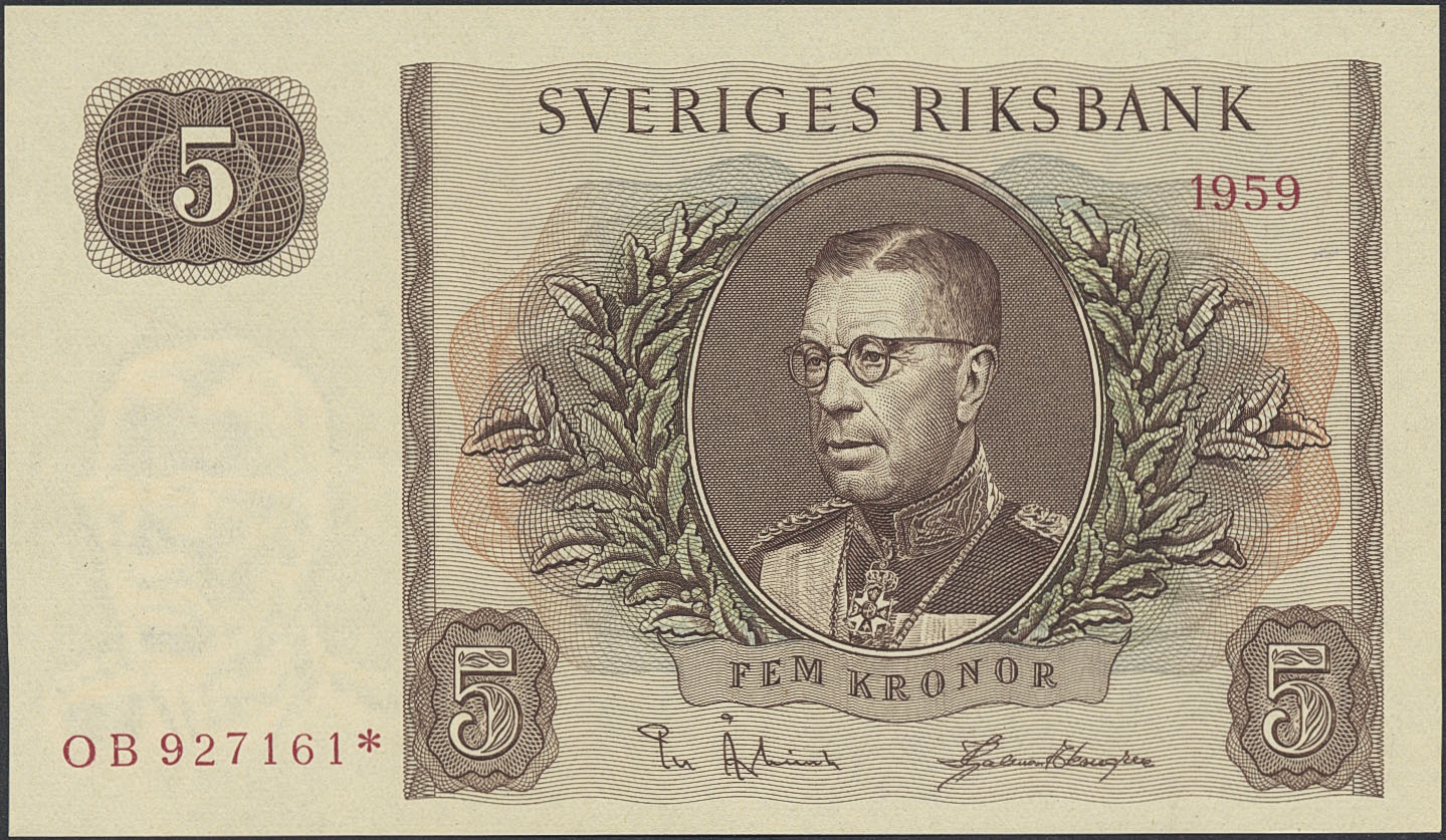 Banknotes, Sweden. SF Q9:6, 5 kronor 1959. OB927161*. Replacement note. 0.