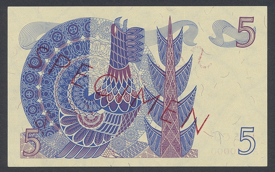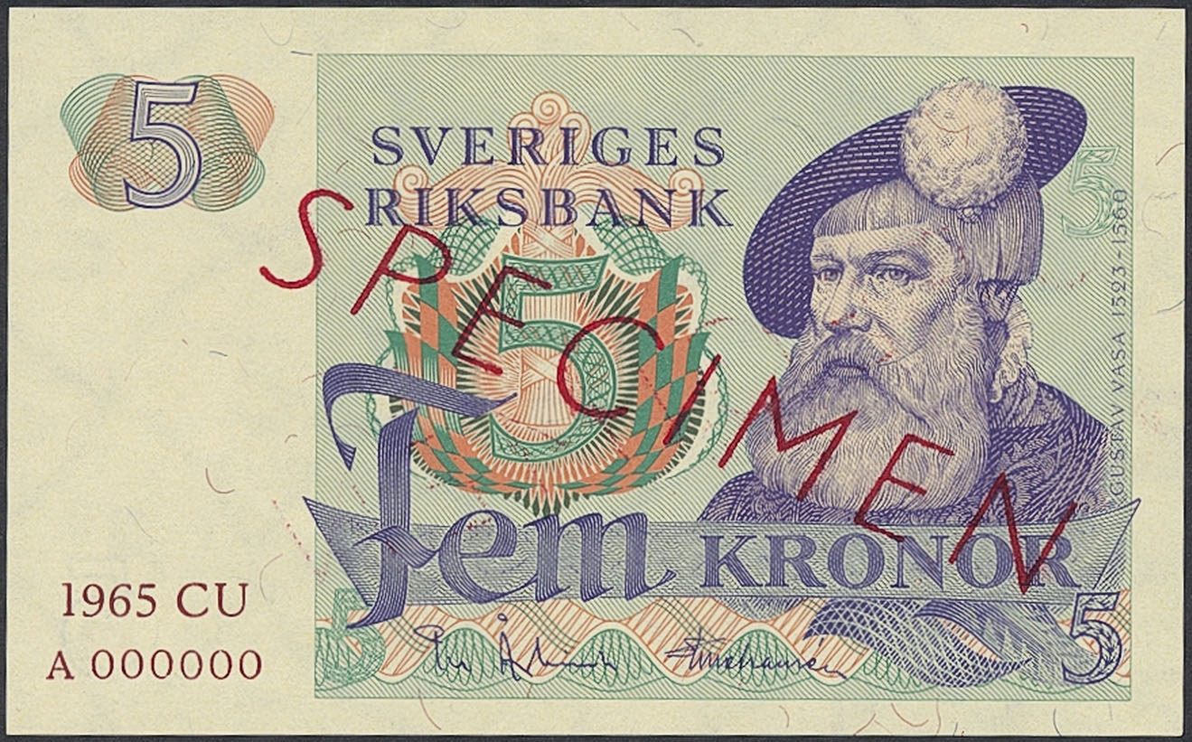 Banknotes, Sweden. SF Q11a:1, 5 kronor 1965. CU A000000. Specimen note with red overprint on front and back. Not folded, minor handling marks. 01/0.