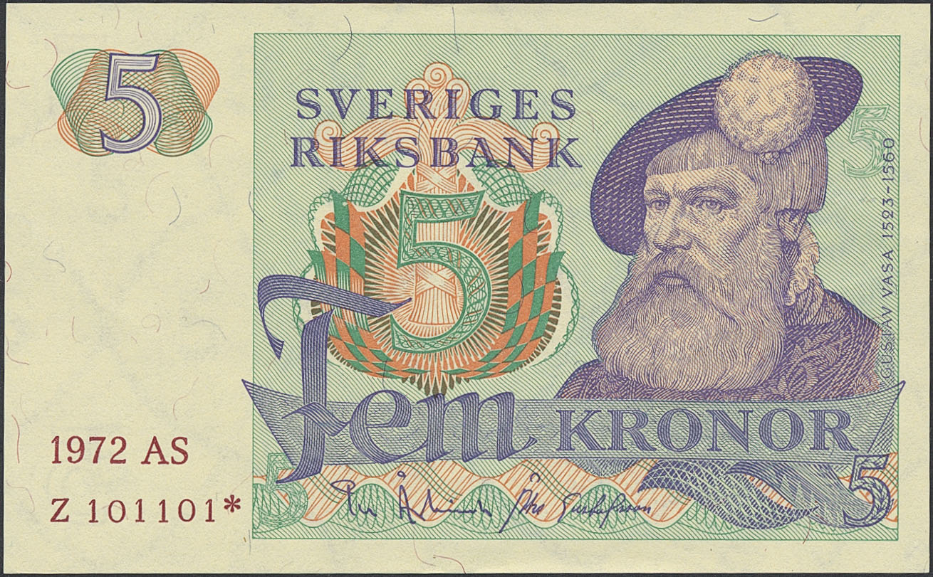 Banknotes, Sweden. SF Q11:11, 5 kronor 1972. AS Z101101*. Replacement note. 01/0.