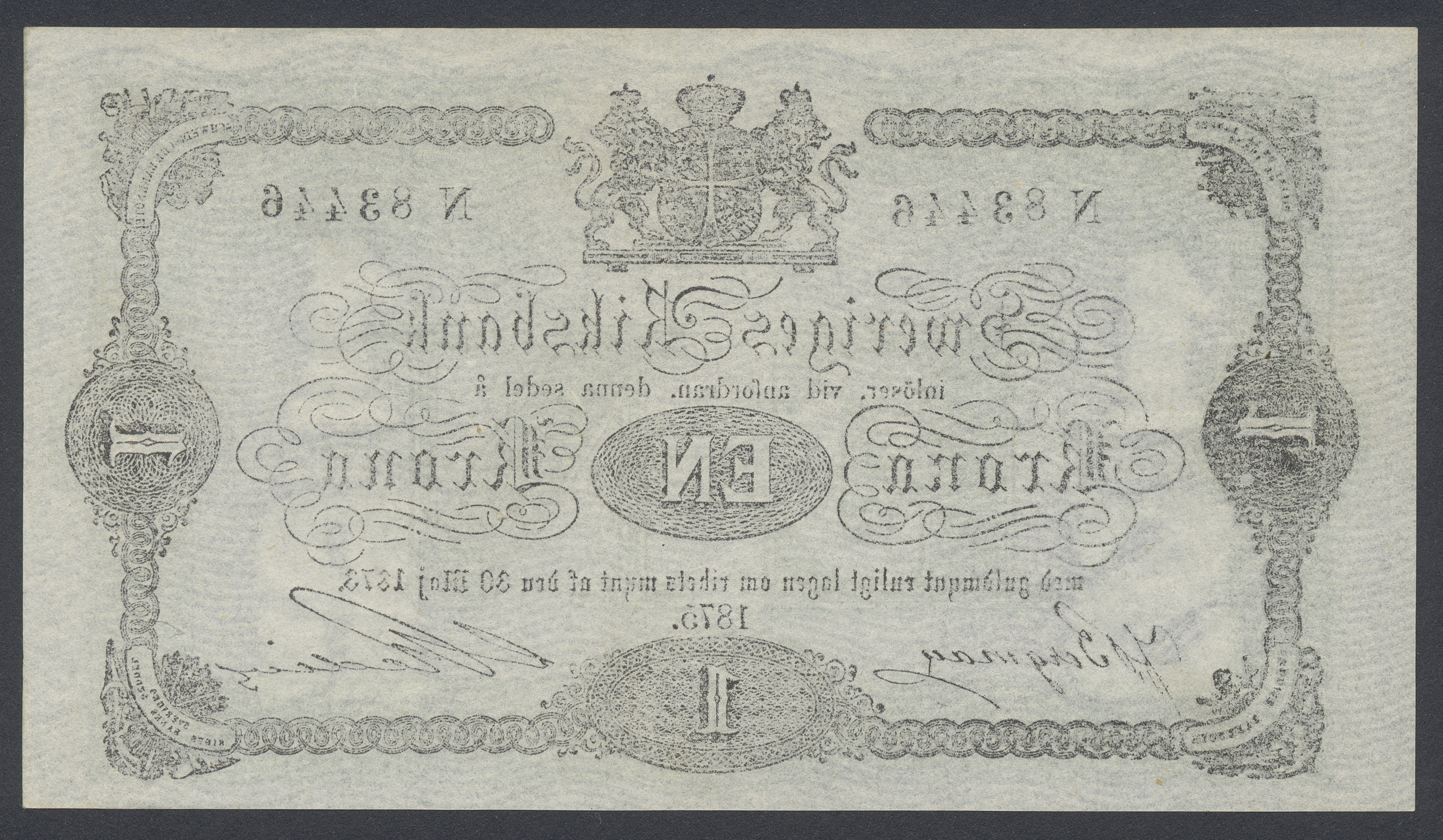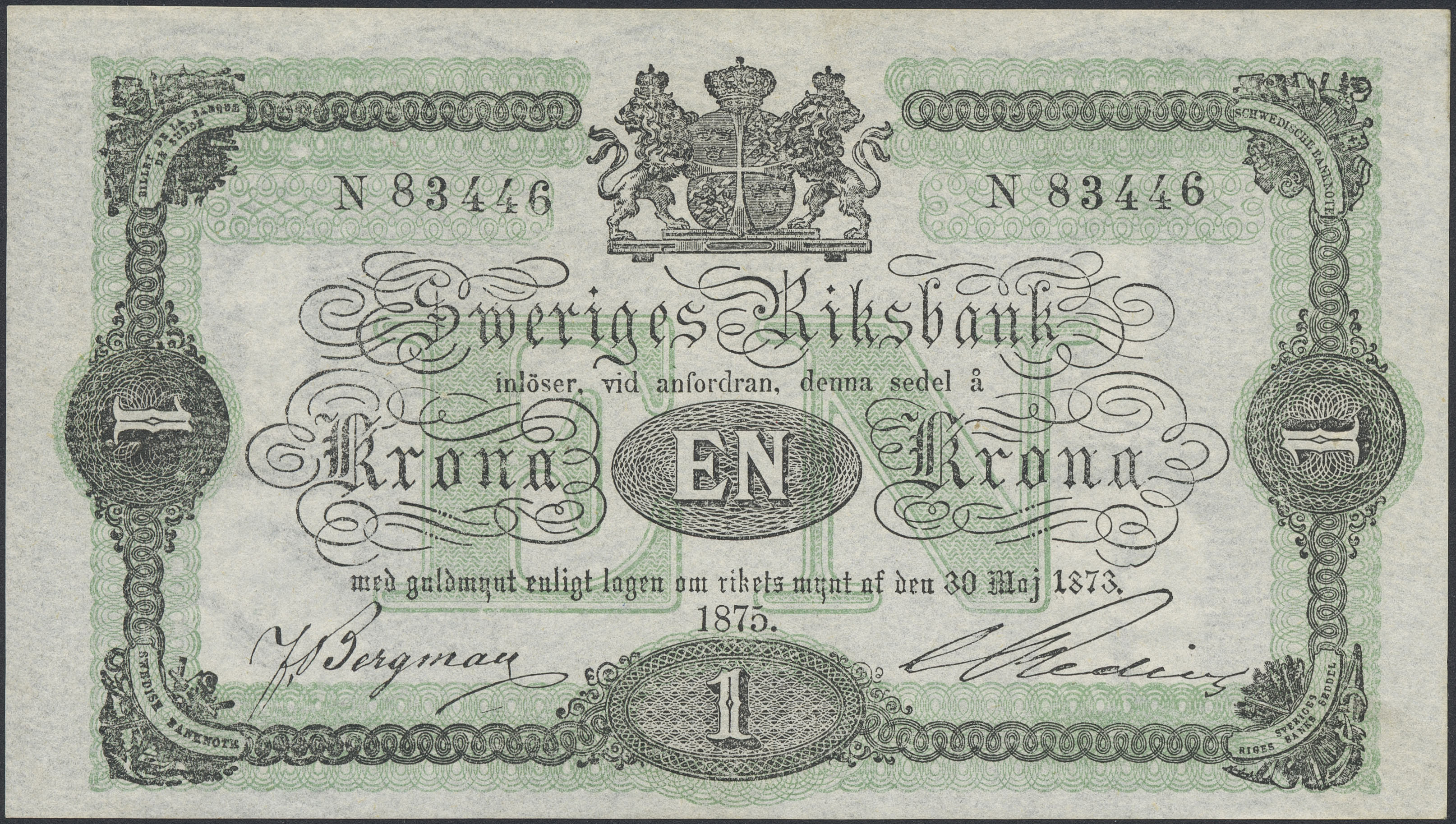 Banknotes, Sweden. SF P1:1, 1 krona 1875. N 83446. Fresh example with only minor handling marks. 01/0.