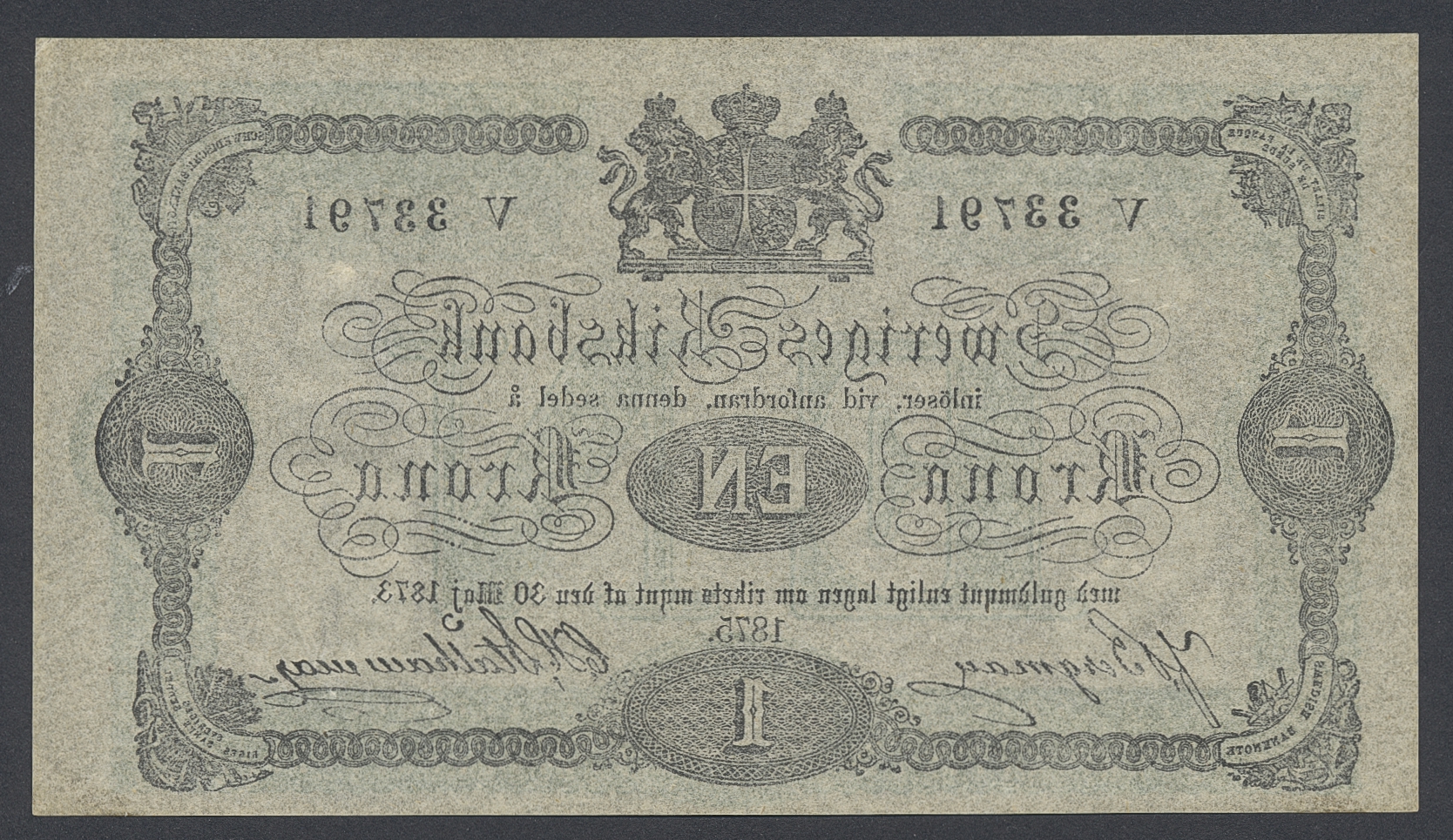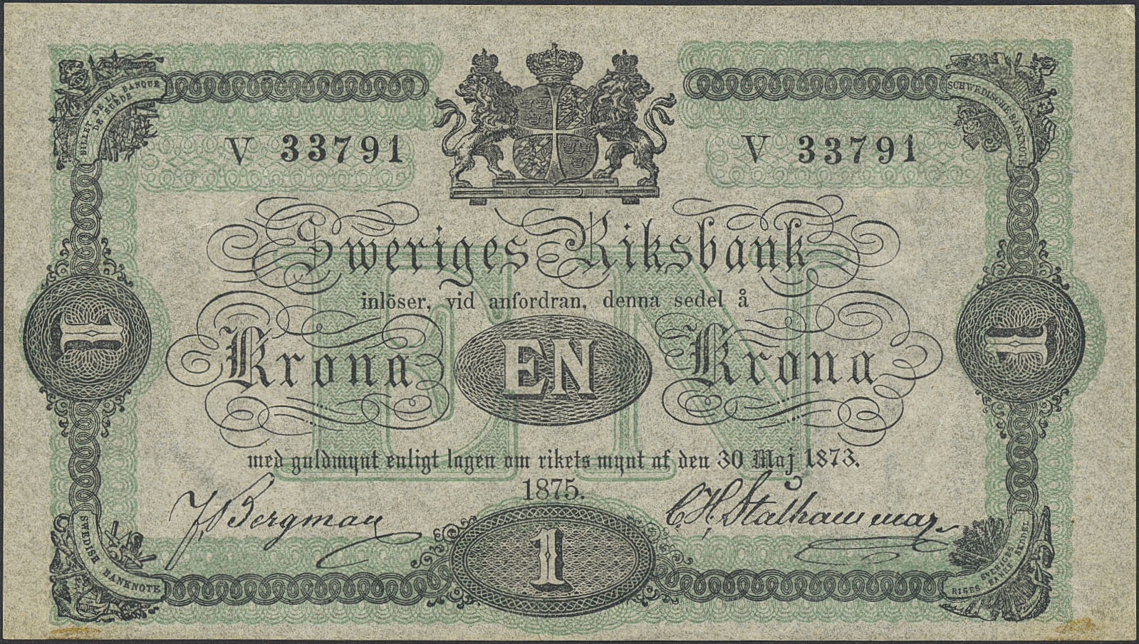 Banknotes, Sweden. SF P1:2, 1 krona 1875. V 33791. Minor handling marks, small spot in lower right corner. Not folded. 01.