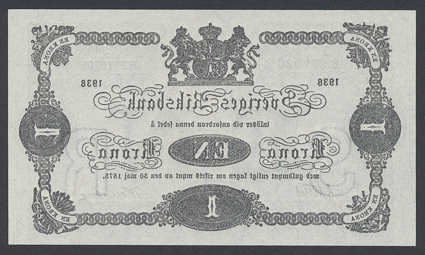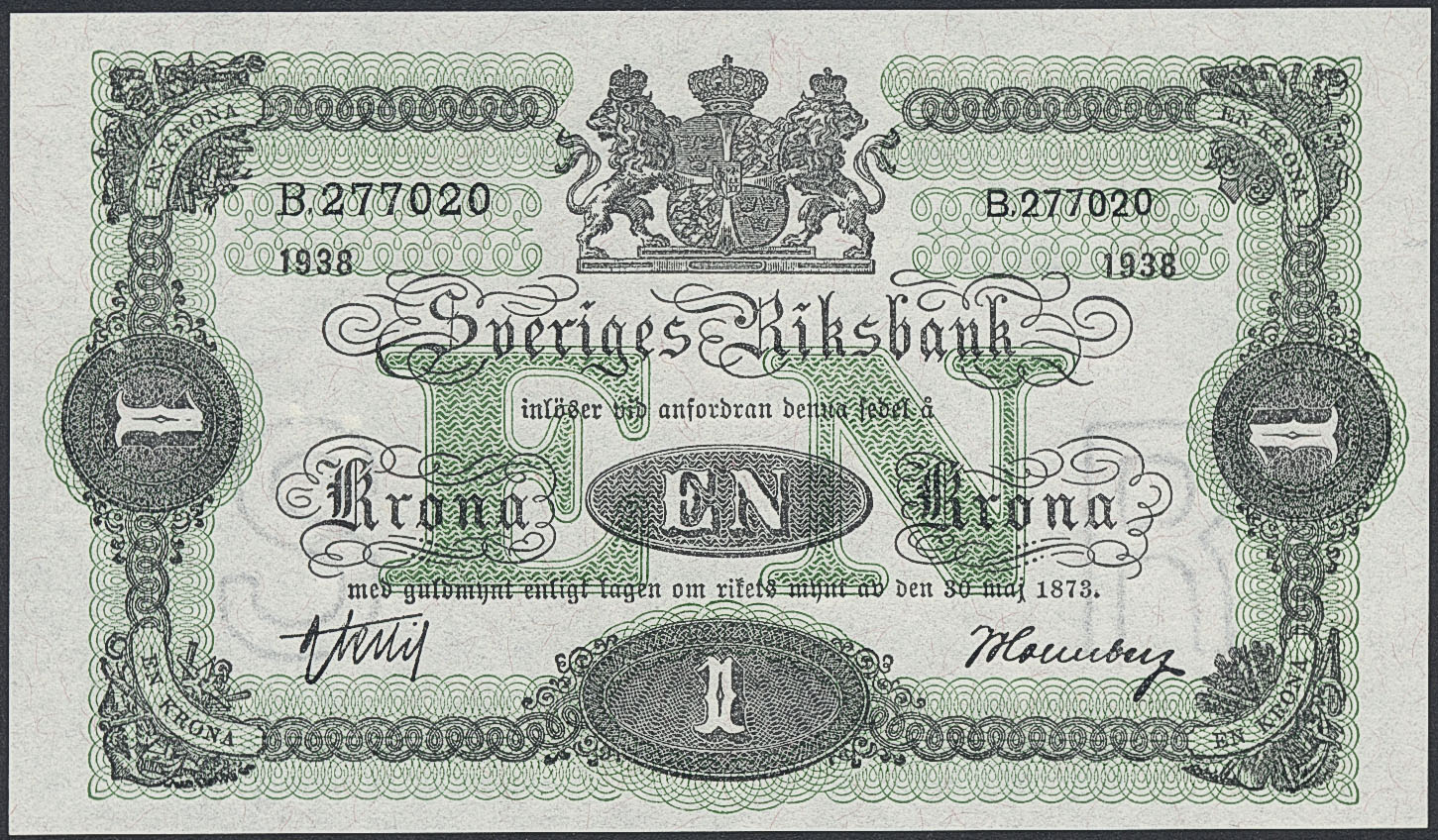 Banknotes, Sweden. 1 krona 1938. B277020. Scarce date not issued. 0.