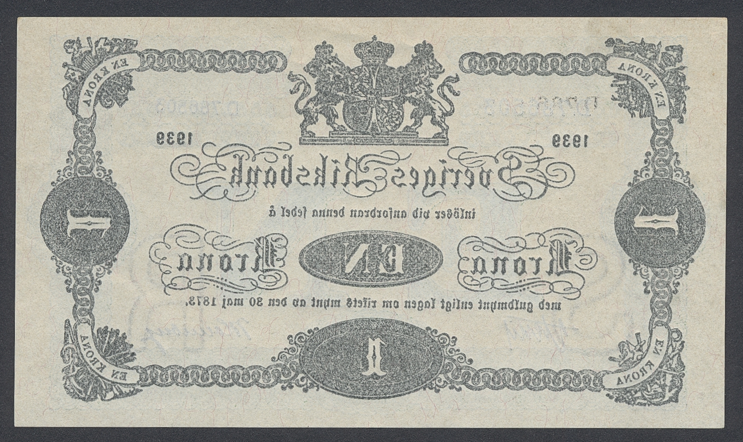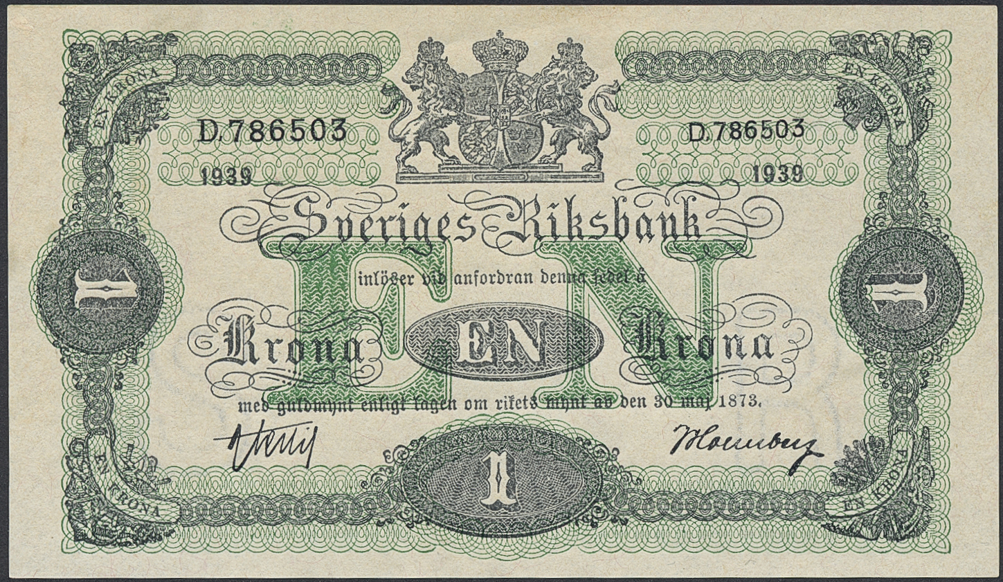 Banknotes, Sweden. DSS1165, 1 krona 1939. No: D. 786503, R. 01.