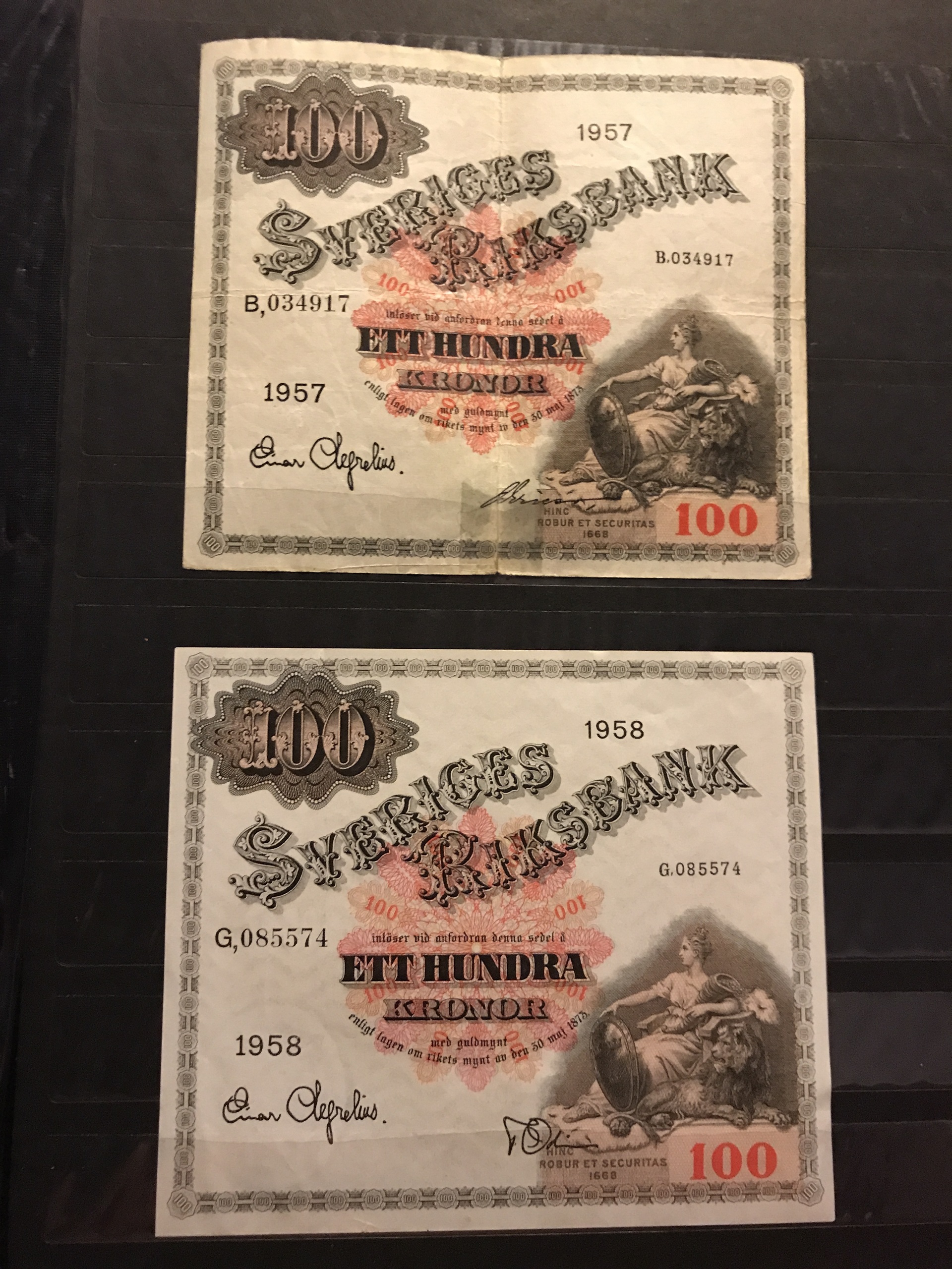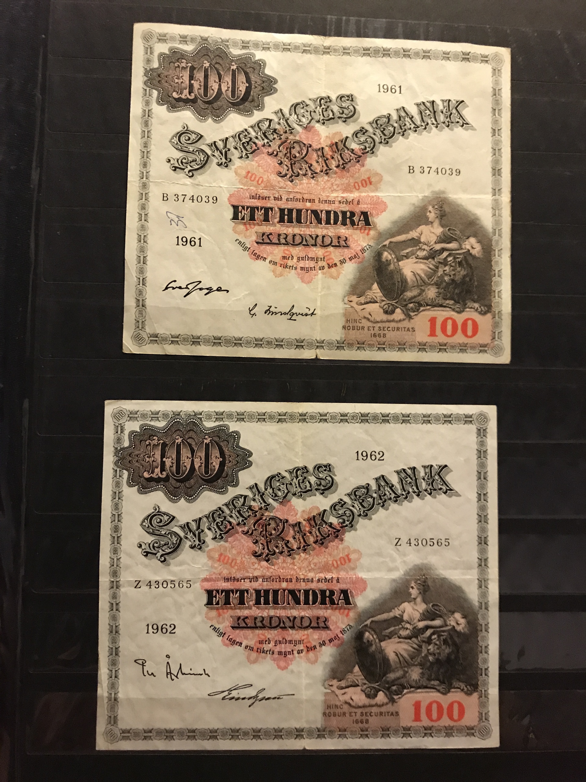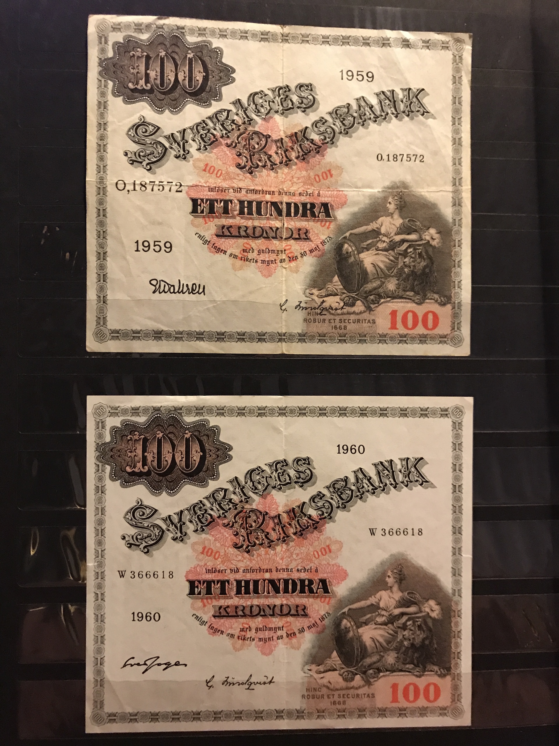 Banknotes, Sweden. Album with eight different 100 kr 1955–63 and seven different 50 kr 1944–1962. Mixed quality. Please see a selection of scans at www.philea.se.