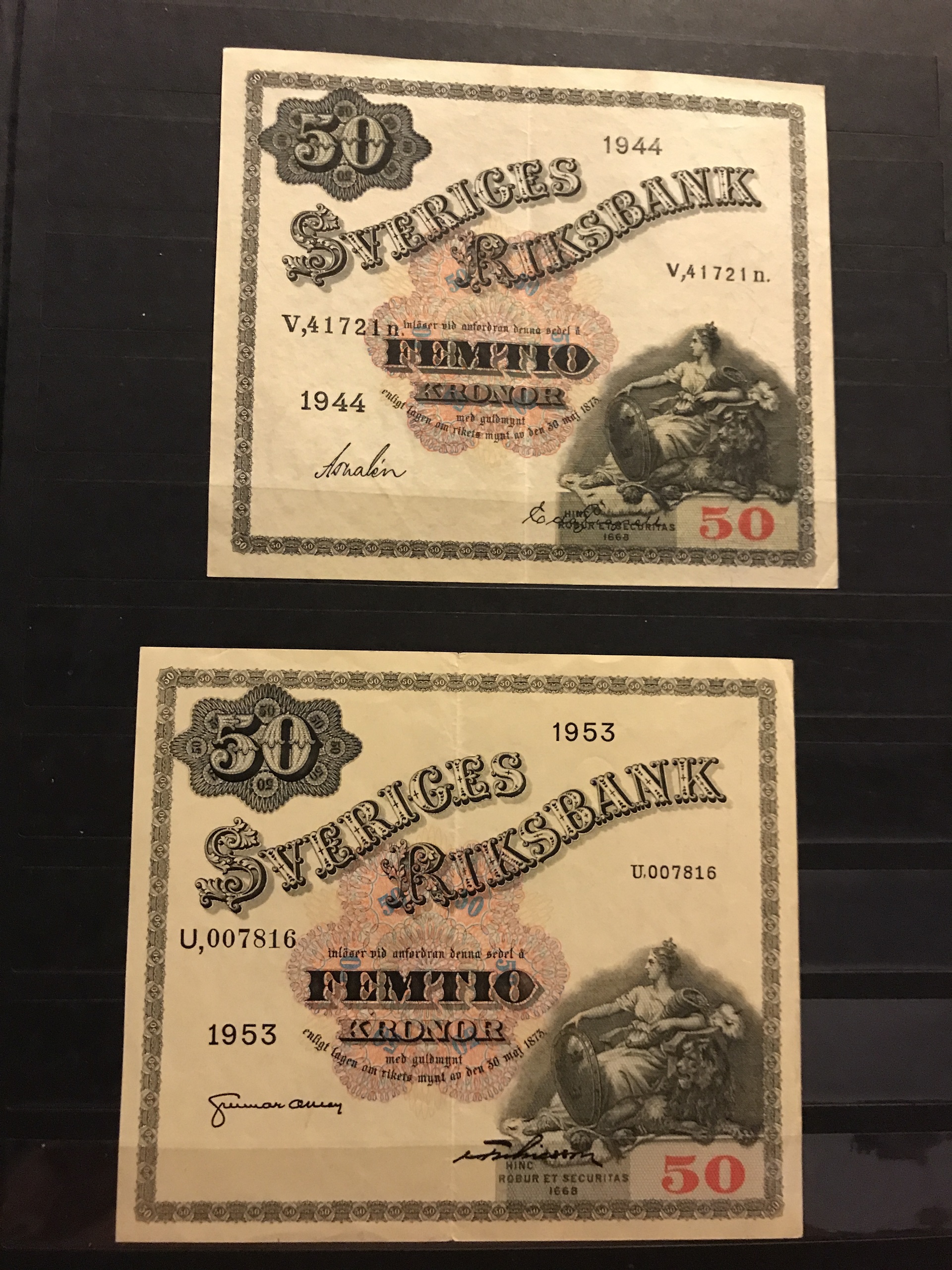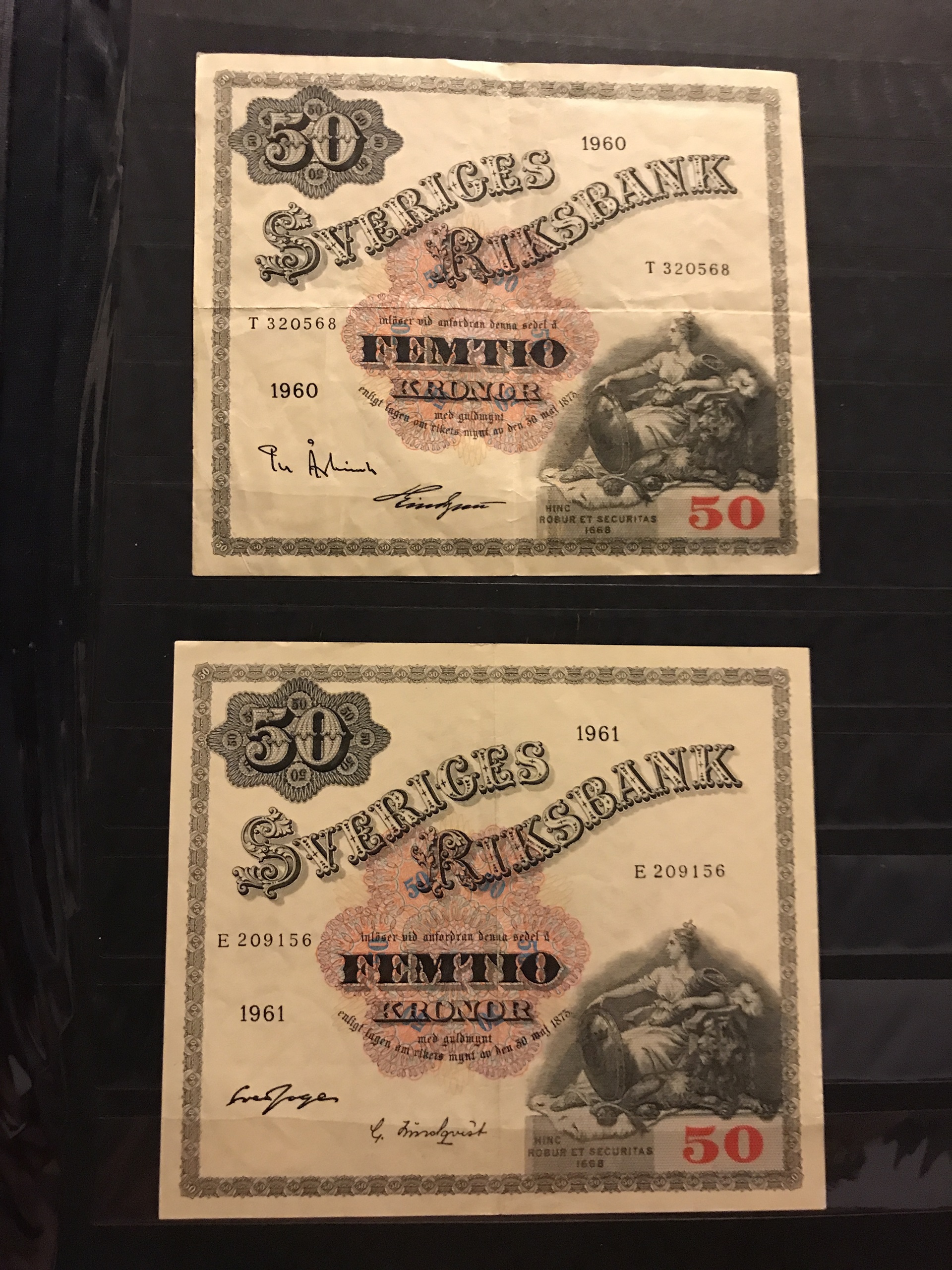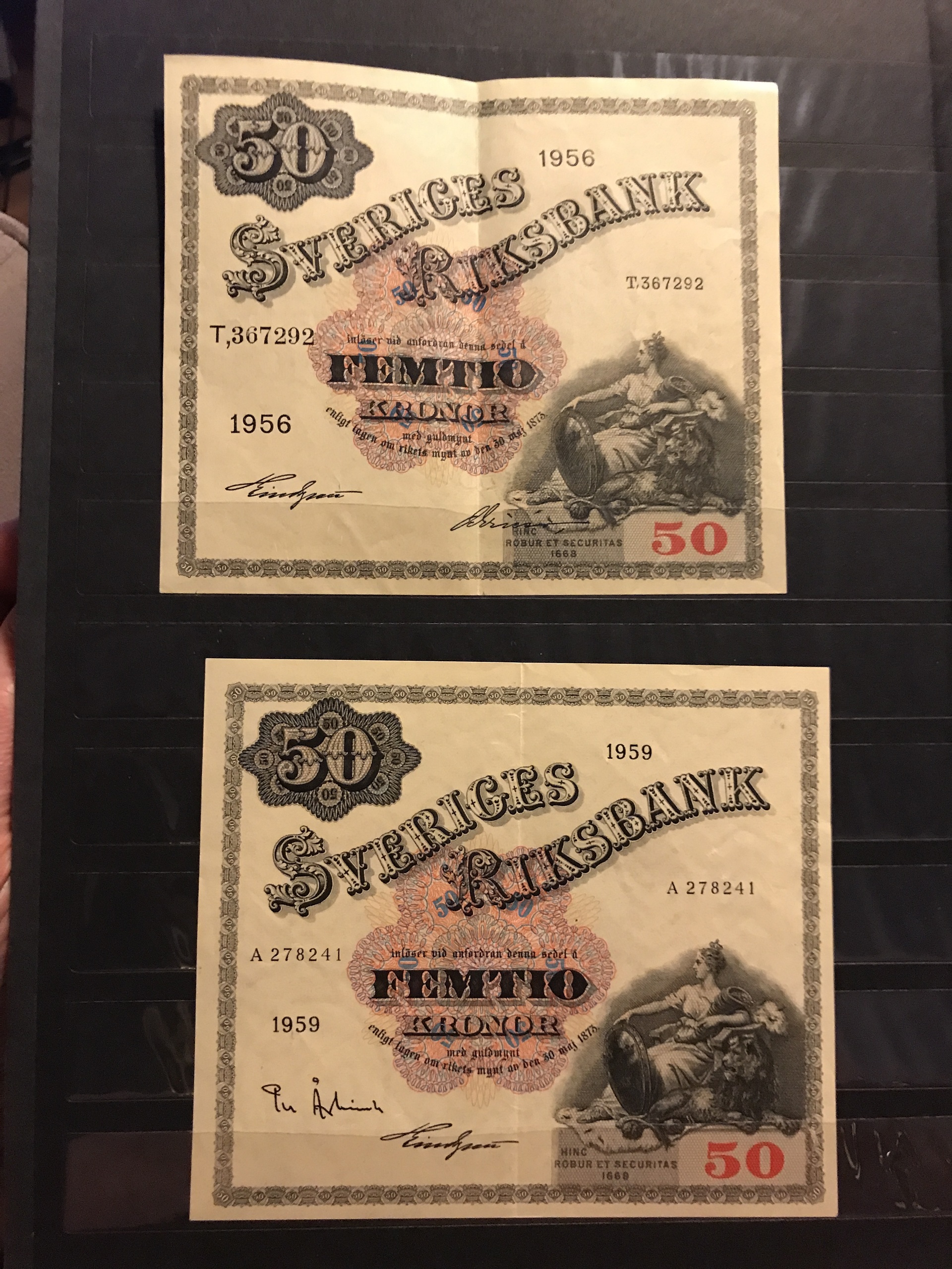 Banknotes, Sweden. Album with eight different 100 kr 1955–63 and seven different 50 kr 1944–1962. Mixed quality. Please see a selection of scans at www.philea.se.