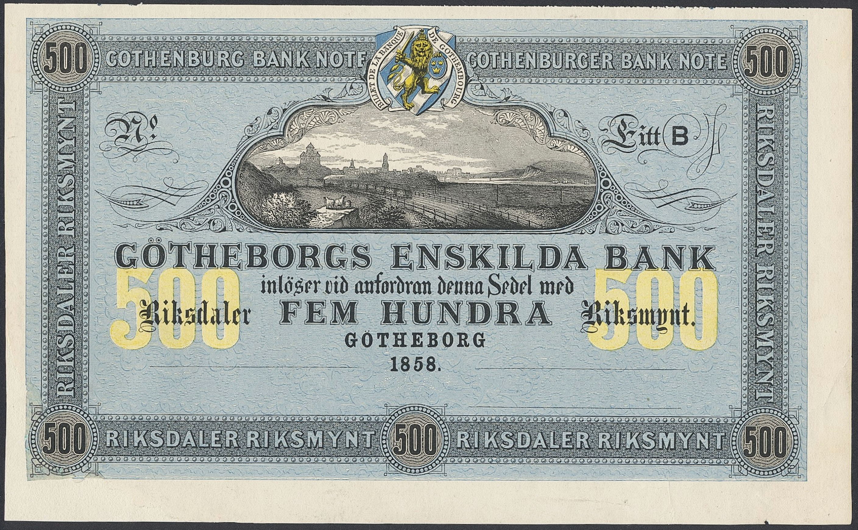 Private banknotes, Sweden. Pick S210p, 500 kronor 1858. Litt B. Proof/remainder of this rare uniface note. Lower left corner repaired. 01.
