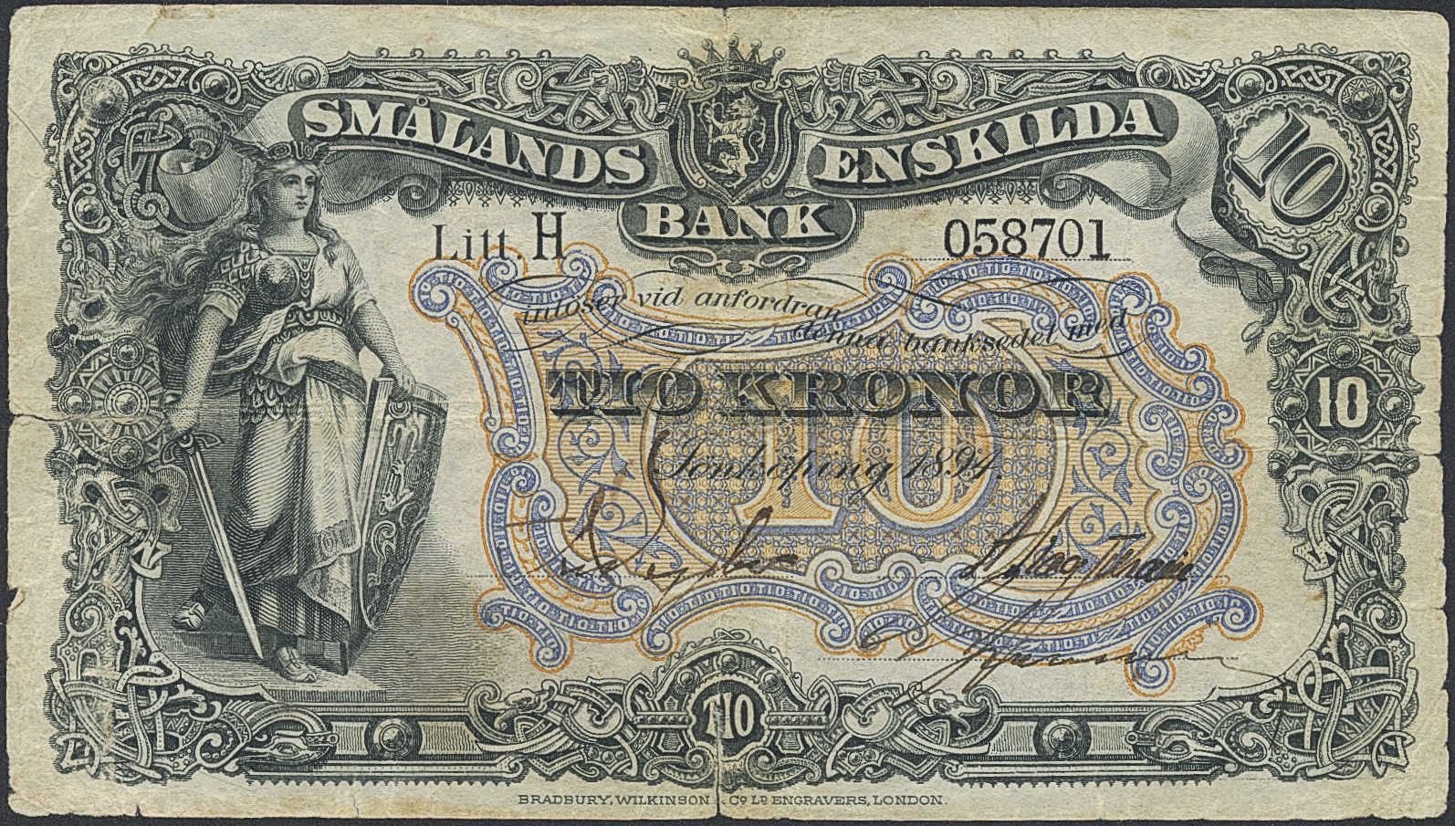Private banknotes, Sweden. Pick S497, 10 kronor 1894. Litt H. No 058701. Several large tears. 2/1?