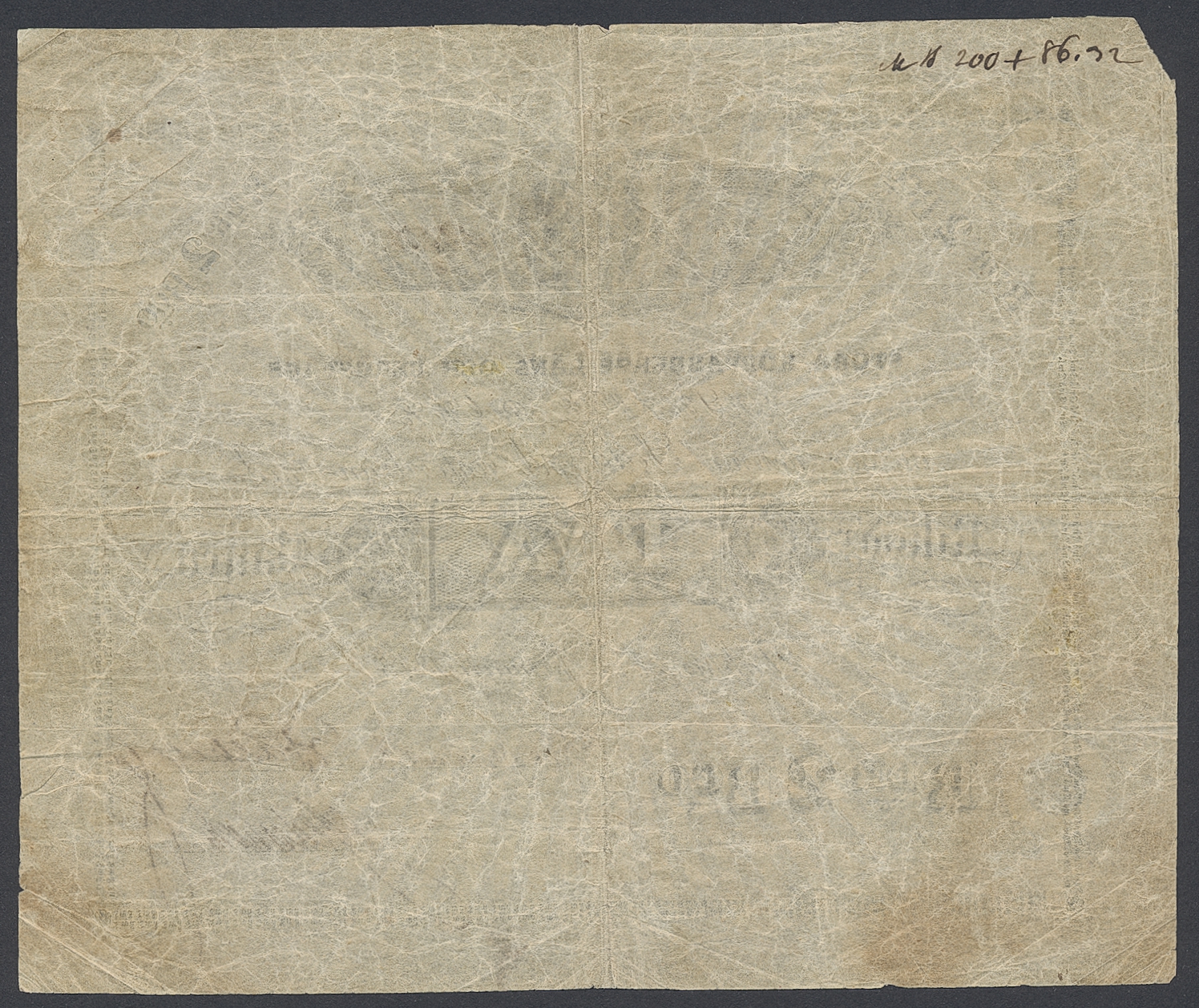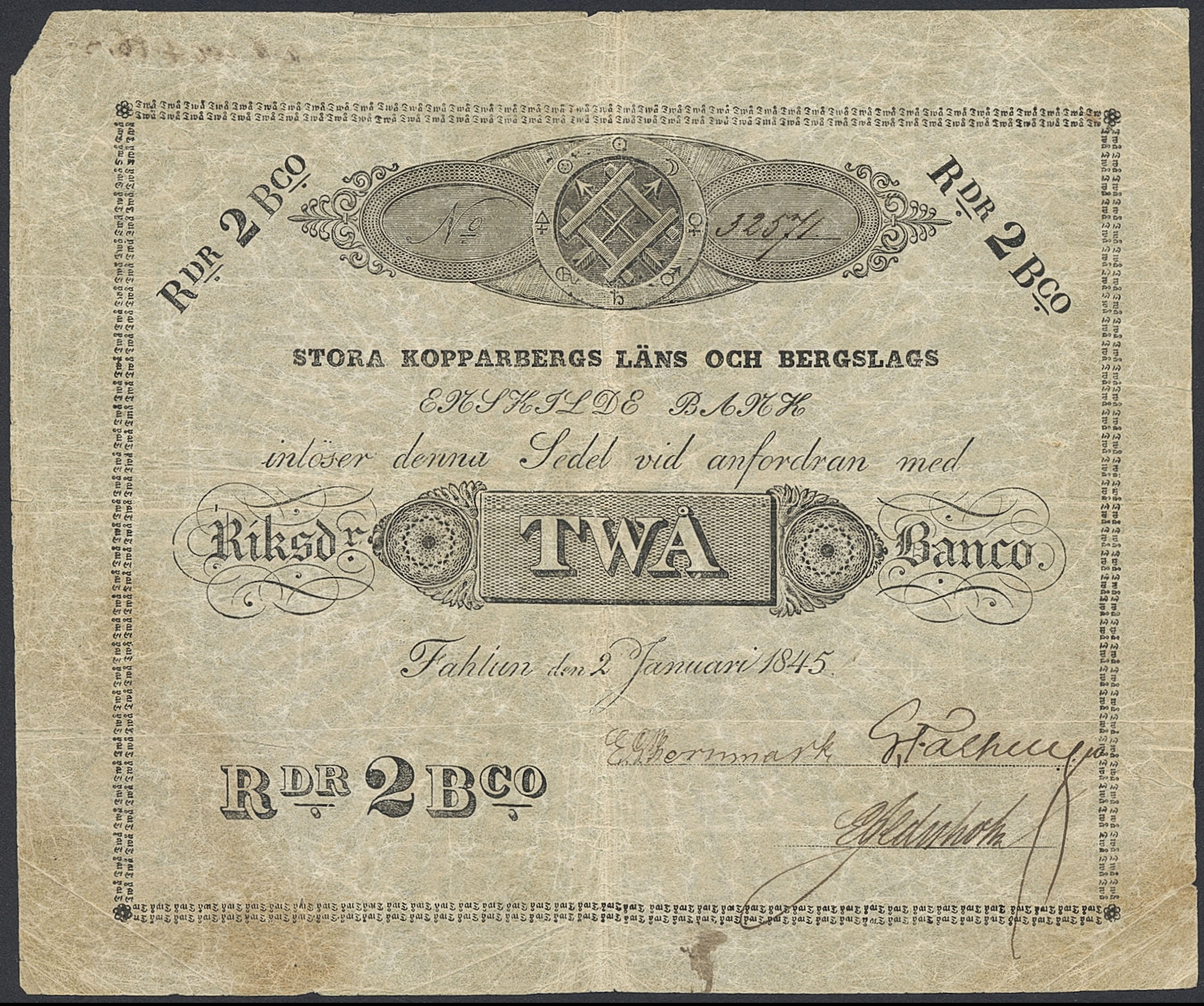 Private banknotes, Sweden. Pick S521g, 2 riksdaler banco 1845. No 32571. Fresh example of this large note, minor corner loss of upper left corner and small ink writing on reverse. Interesting documentation from 1923 accompanying the note whereby it was sent to Holmbergs Mynthandel for appraisal, and later returned to its owner. 1/1+.