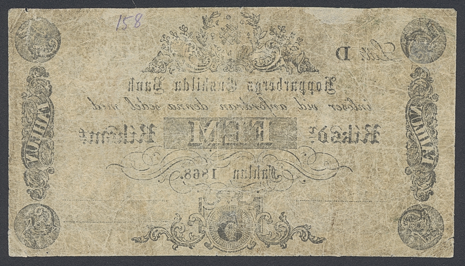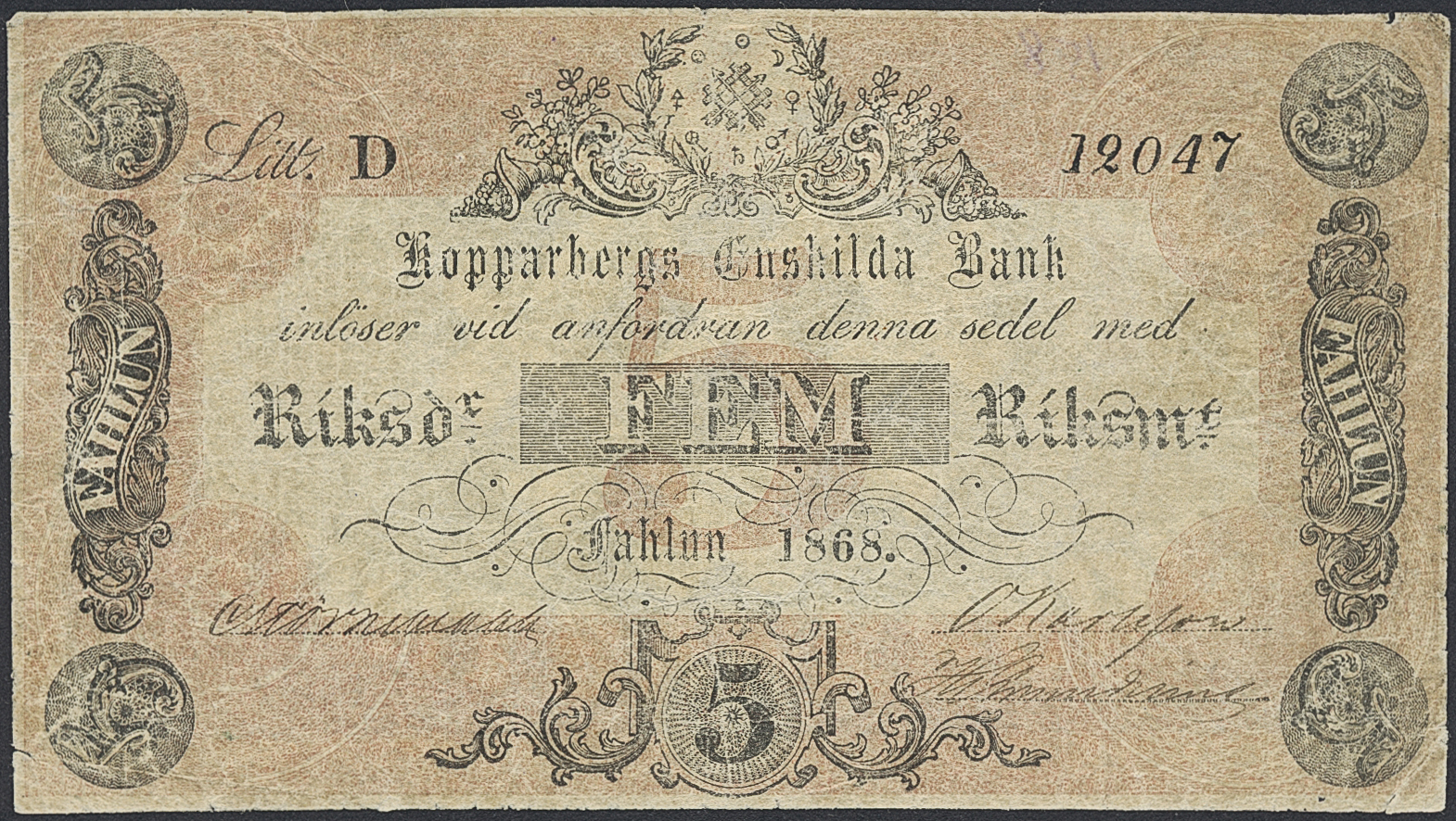 Private banknotes, Sweden. Pick S558b, 5 riksdaler riksmynt 1868. Litt D. No 12047. Pencil writing on back, small thinning. 1?/1.