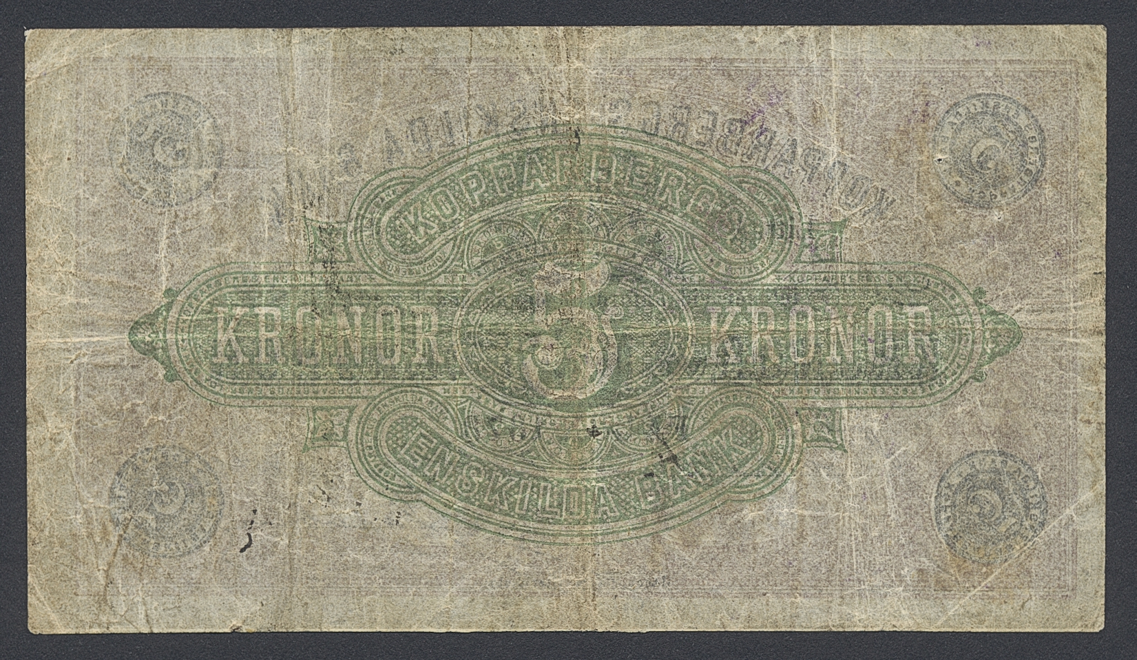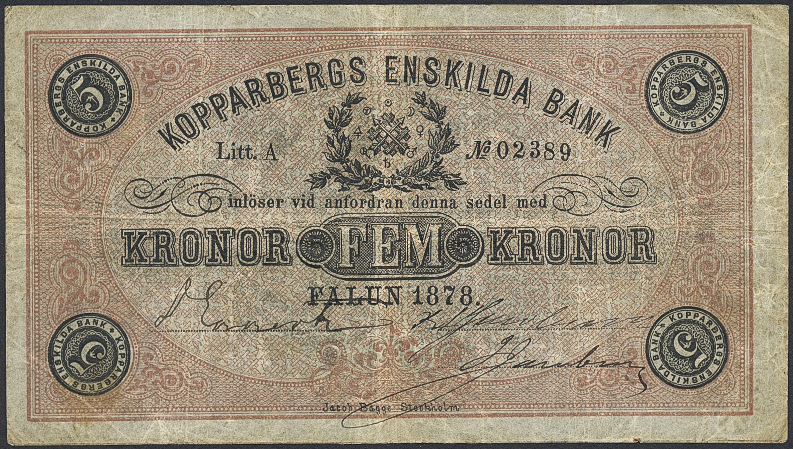 Private banknotes, Sweden. Pick S566, 5 kronor 1878. Litt A No 02389. Ex Nordlind Auction 2011 lot 1104. 1.