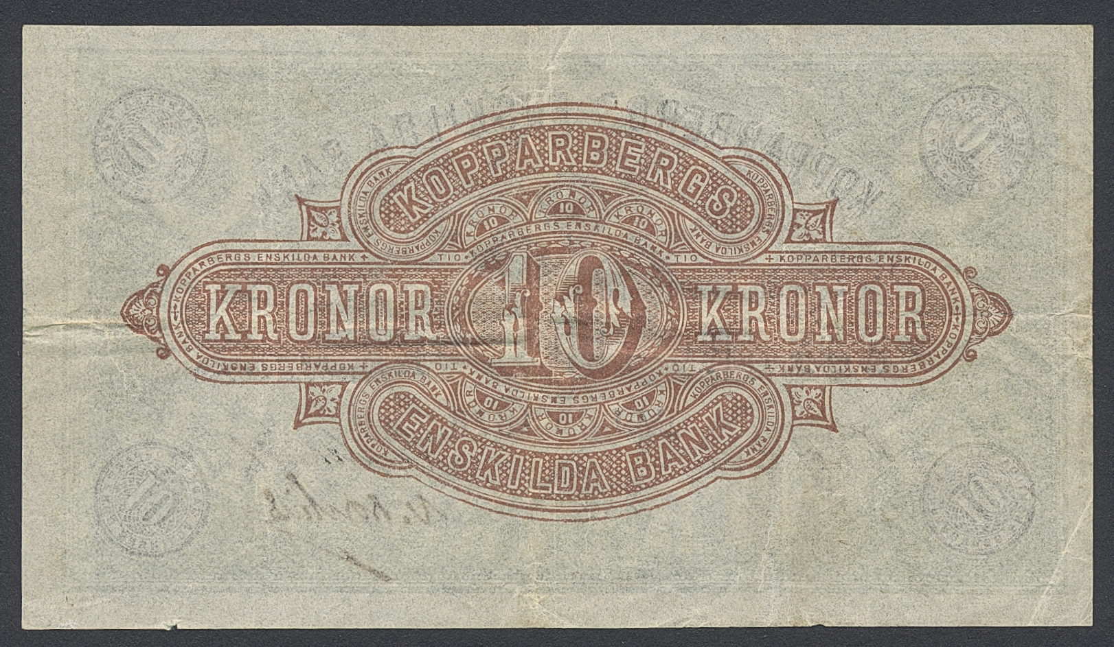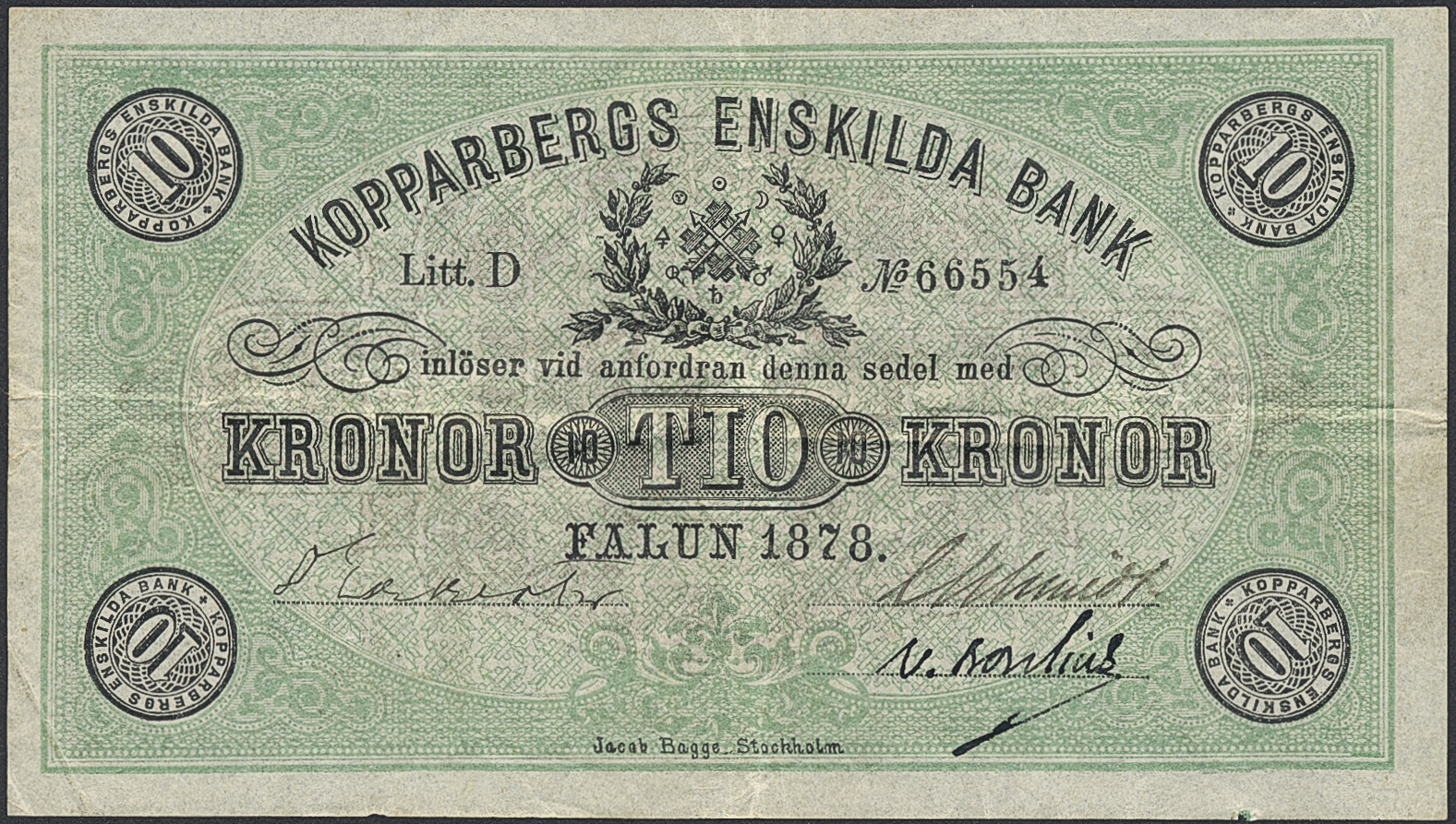 Private banknotes, Sweden. Pick S567, 10 kronor 1878. Litt D. No 66554. 1+.