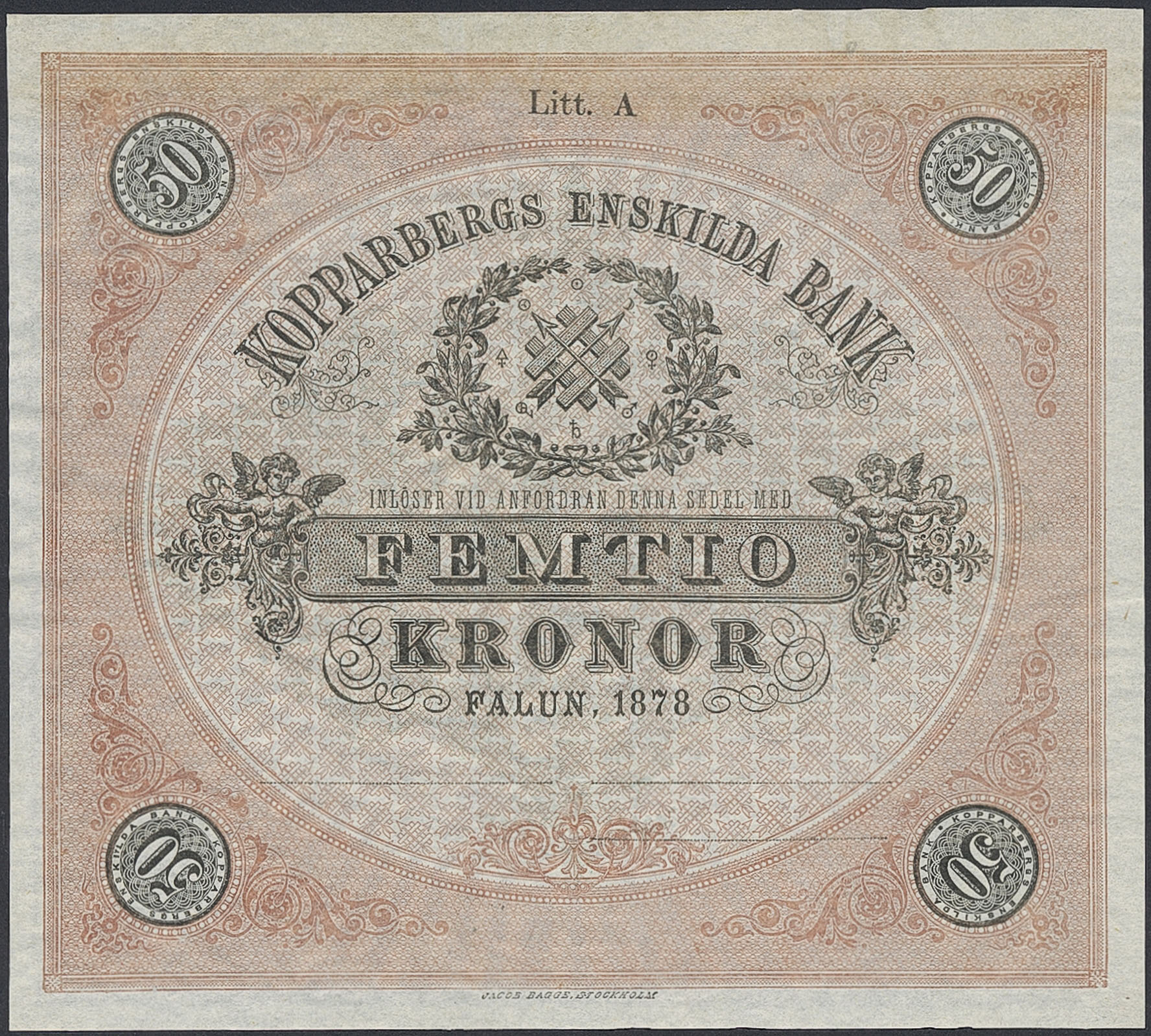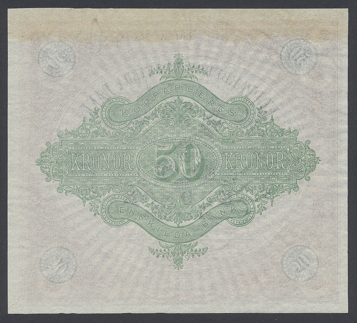 Private banknotes, Sweden. Pick S568r, 50 kronor 1878. Litt A. Unissued remainder without signatures. Upper part of note somewhat toned. 01/0.